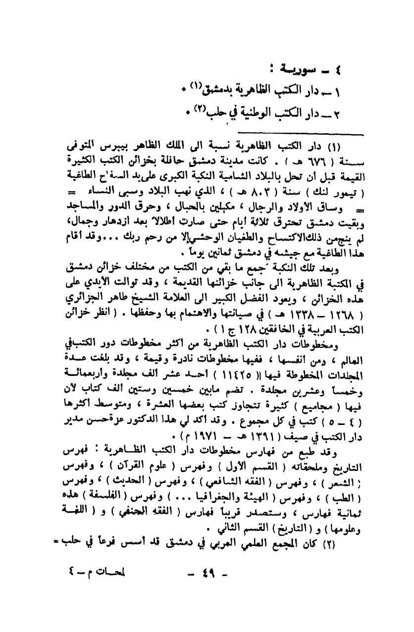 1 دار الكتب الظاهرية نسبة إلى الملك الظاهر بيبرس المتوفي سنة 676هـ. كانت مدينة دمشق حافلة بخزائن الكتب الكثيرة القيمة قبل أن تحل بالبلاد الشامية النكبة الكبرى على يد السفاح الطاغية تيمور لنك سنة 803هـ، الذي نهب البلاد وسبى النساء، وساق الأولاد والرجال، وساق الأولاد والرجال، مكبلين بالحبال، وحرق الدور والمساجد وبقيت دمشق تحترق ثلاثة أيام حتى صارت أطلالًا بعد ازدهار وجمال، لم ينج من ذلك الاكتساح والطغيان الوحشي إلا من رحم ربك. وقد أقام هذا الطاغية مع جيشه في دمشق ثمانين يومًا.