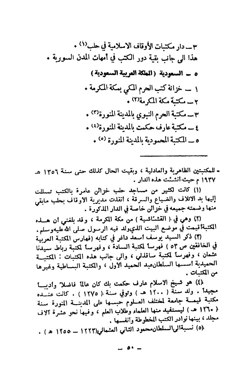2 في الخافقين ص53 فهرسًا لمكتبة السادة، وفهرسًا لمكتبة رباط سيدنا عثمان، وفهرسًا لمكتبة ساقذلي، وإلى جانب هذه المكتبات: المكتبة الحميدية أسسها السلطان عبد الحميد الأول، والمكتبة البساطية وغيرها من المكتبات.