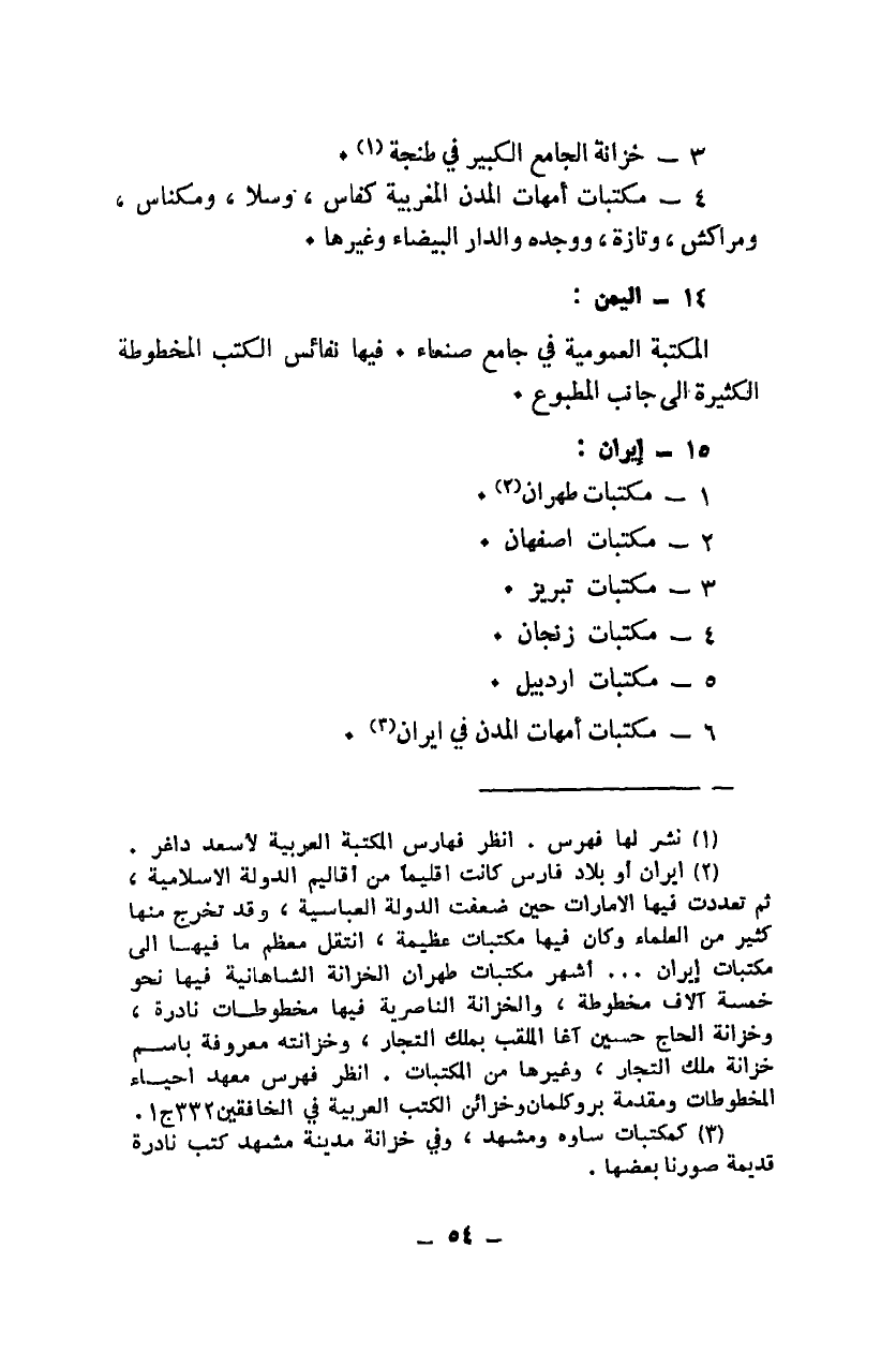 1 إيران أو بلاد فارس كانت إقليمًا من أقاليم الدولة الإسلامية، ثم تعددت فيها الإمارات حين ضعفت الدولة العباسية، وقد تخرج منها كثير من العلماء وكان فيها مكتبات عظيمة، انتقل معظم ما فيها إلى مكتبات إيران ... أشهر مكتبات طهران الخزانة الشاهانية فيها نحو خمسة آلاف مخطوطة، والخزانة الناصرية فيها مخطوطات نادرة، وخزانة الحاج حسين آغا الملقب بملك التجار، وخزانته معروفة باسم خزانة ملك التجار، وغيرها من المكتبات. انظر فهرس معهد إحياء المخطوطات ومقدمة بروكلمان وخزائن الكتب العربية في الخافقين 332 ج1.