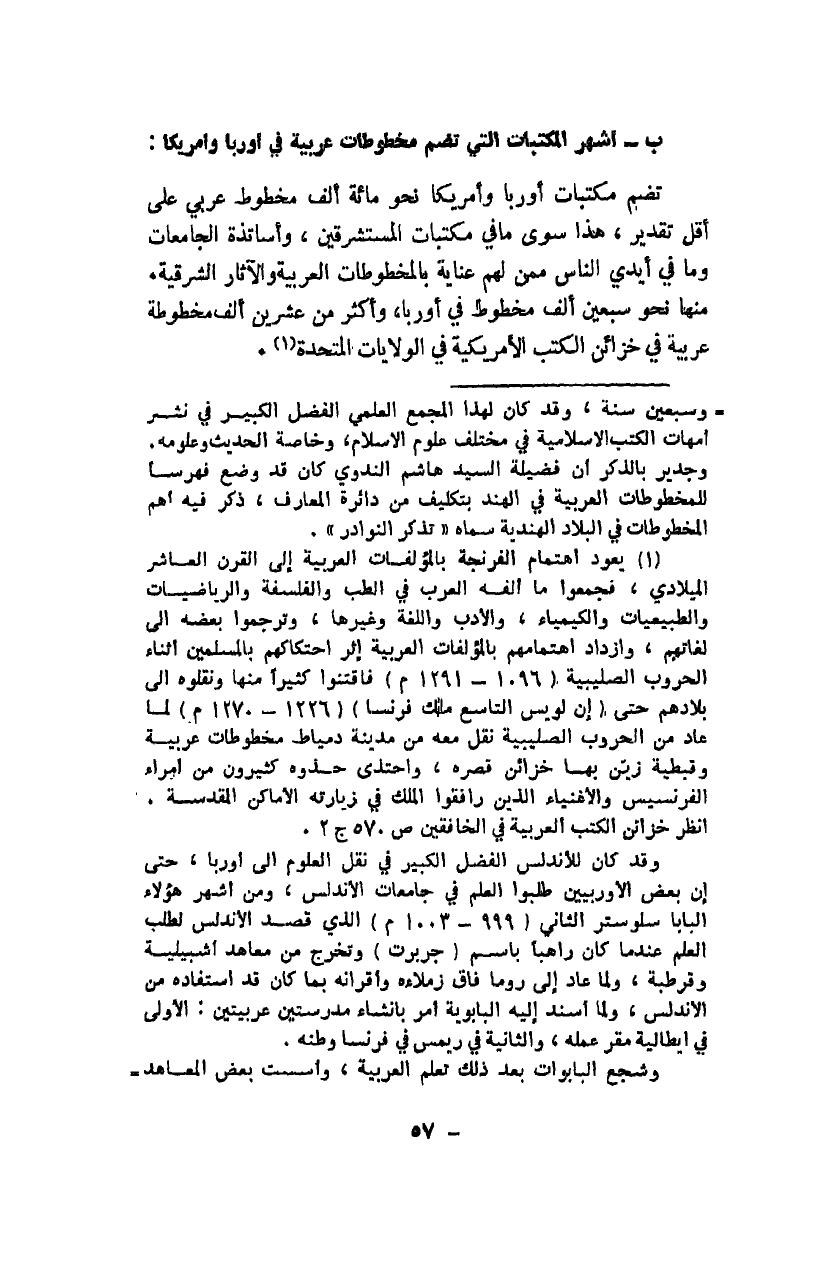 تضم مكتبات أوربا وأمريكا نحو مائة ألف مخطوط عربي علي أقل تقدير، هذا سوى ما مكتبات المستشرقين، وأساتذة الجامعات وما في أيدي الناس ممن لهم عناية بالمخطوطات العربيو والآثار الشرقية؛ منها نحو سبعين ألف مخطوط في أوربا، وأكثر من عشرين ألف مخطوطة عربية في خزائن الكتب الأمريكية في الولايات المتحدة1.