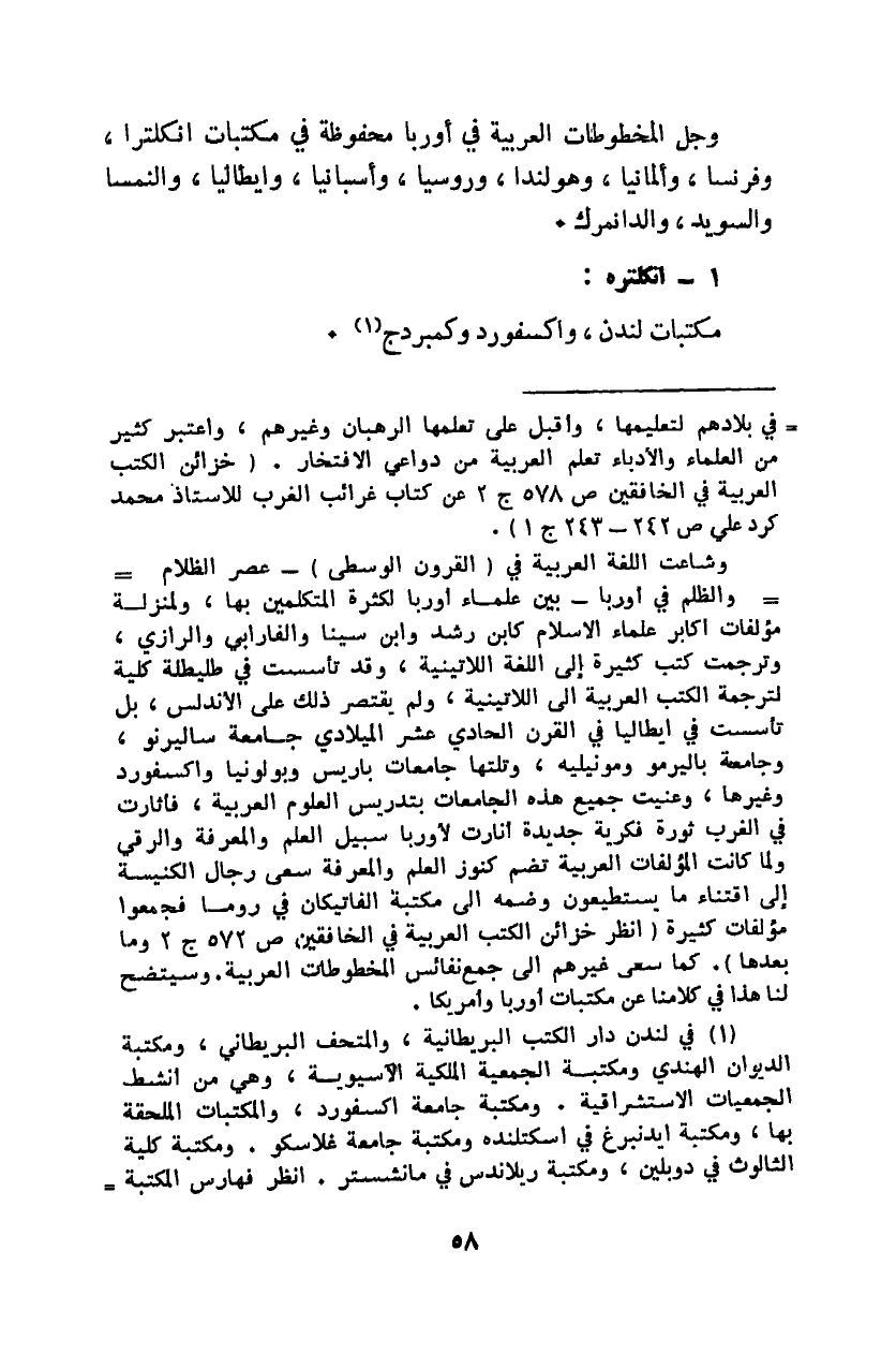 1 في لندن دار الكتب البريطانية، والمتحف البيريطان، ومكتبة الديوان الهندي ومكتبة الجمعية الملكية الآسيوية، وهي من أنشط الجمعيات الاستشرافية. ومكتبة جامعة أكسفورد، والمكتبات الملحقة بها، ومكتبة إيدنبرغ في أسكتلنده ومكتبة جامعة غلاسكو. ومكتبة كلية الثالوث في دوبلين، ومكتبة ريلاندس في مانشستر. انظر فهارس المكتبة العربية في الخافقين، وقارن بمقدمة بروكلمان. ويعود اهتمام إنكلترا بالمخطوطات العربية إلى العصور الوسطى، وكانت ترسل الوفود والمندوبين إلى البلاد العربية والإسلامية لاقتناء المخطوطات منها. انظر خزائن الكتب العربية في الخافقين ص589 ج2.