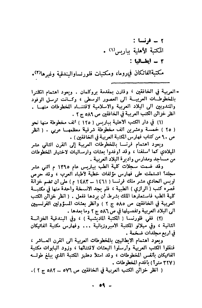 1 في دار الكتب الأهلية بباريس 125 ألف مخطوطة منها نحو 25 خمسة وعشرين ألف مخطوطة شرقية معظمها عربي. انظر ص 90 من كتاب فهارس المكتبة العربية في الخافقين.