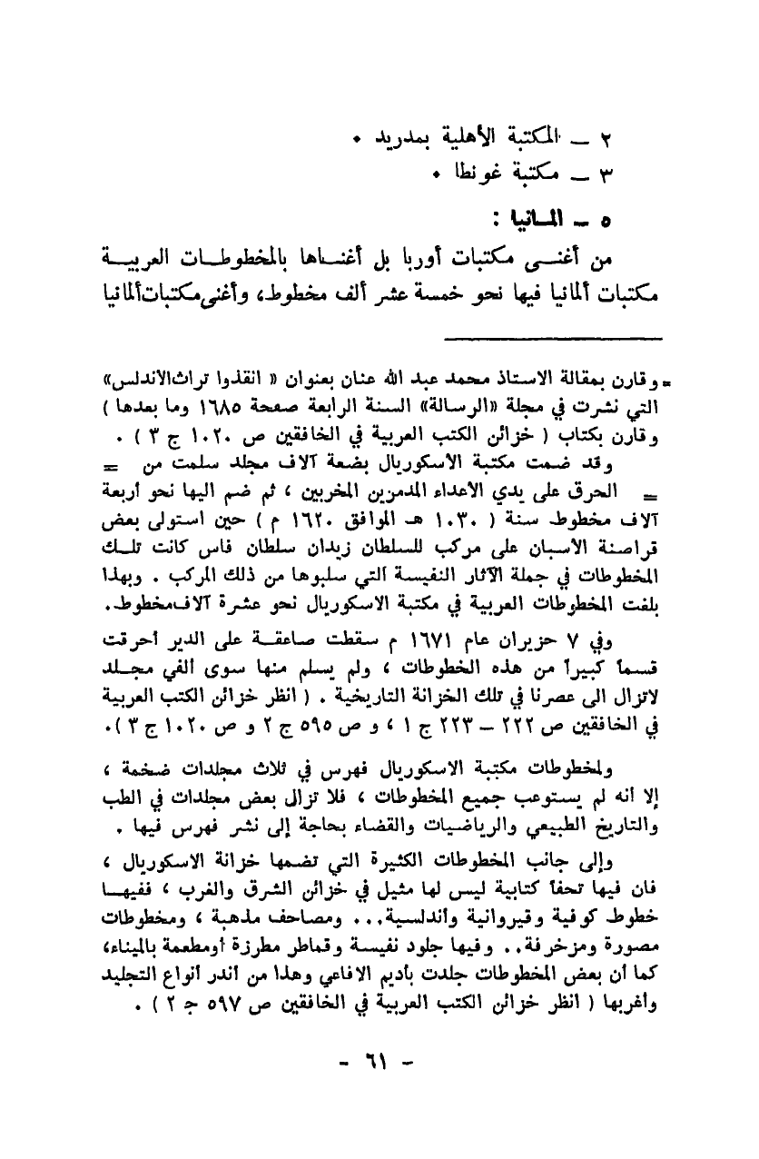 = وقارن بمقالة الأستاذ محمد عبد الله عنان بعنون انقذوا تراث الأندلس التي نشرت في مجلة الرسالة السنة الرابعة صفحة 1685 وما بعدها وقارن بكتاب خزائن الكتب العربية في الخافقين ص1020 ج3.