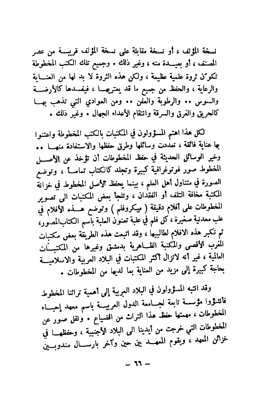 نسخة المؤلف، أو نسخة مقابلة على نسخة المؤلف قريبة من عصر المصنفن أو بعيدة منه، وغير ذلك. وجيمع تلك الكتب المخطوطة تكون ثروة علمية عظيمة؛ ولكن هذه الثروة لا بد لها من العناية والرعاية، والحفظ من جميع ما قد يعتريها؛ فيفسدها كالأرضية والسوس.. والرطوبة والعفن.. ومن العوادي التي تذهب بها كالحريق والغرق والسرقة وانتقام الأعداء الجهال، وغير ذلك.