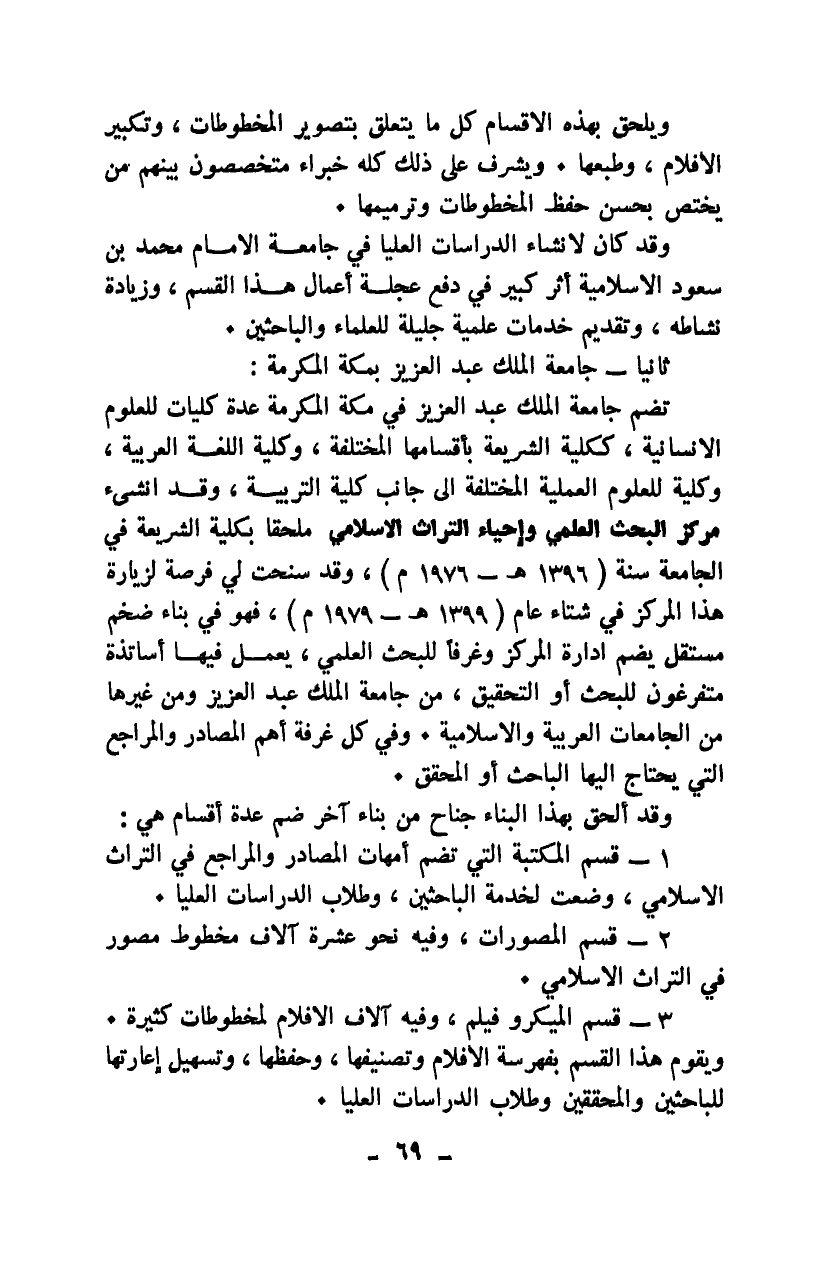 تضم جامعة الملك عبد العزيز في مكة المكرمة عدة كليات للعلوم الإنسانية، ككلية الشريعة بأقسامها المختلفة، وكلية اللغة العربية، وكلية للعلوم العملية المختلفة إلى جانب كلية التربية، وقد أنشئ مركز البحث العلمي وإحياء التراث الإسلامي ملحقًا بكلية الشريعة في الجامعة سنة 1396هـ - 1976م، وقد سنحت لي فرصة لزيارة هذا المركز في شتاء عام 1399هـ - 1979م؛ فهو في بناء ضخم مستقل يضم إدارة المركز وغرفًا للبحث العلمي، يعمل فيها أساتذة متفرغون للبحث أو التحقيق، من جامعة الملك عبد العزيز ومن غيرها من الجامعات العربية والإسلامية. وفي كل غرفة أهم المصادر والمراجع التي يحتاج إليها الباحث أو المحقق.