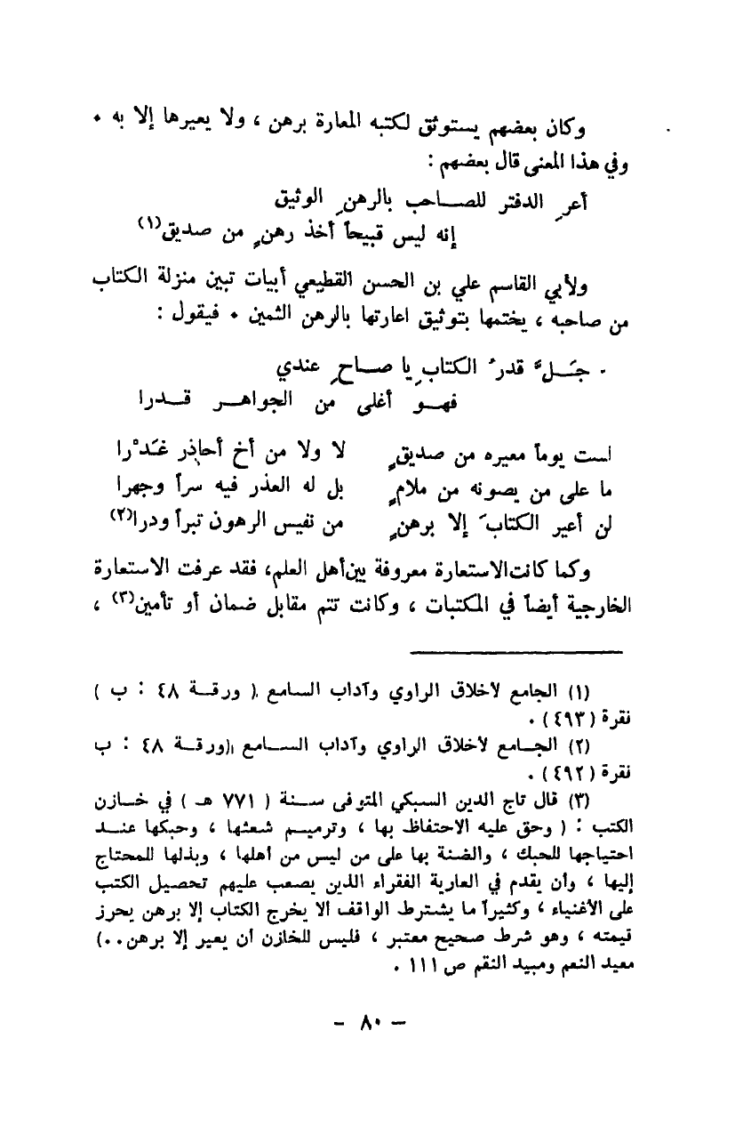 وكان بعضهم يستوثق لكتبه المعارة برهن، ولا يعيرها إلا به. وفي هذا المعنى قال بعضهم: