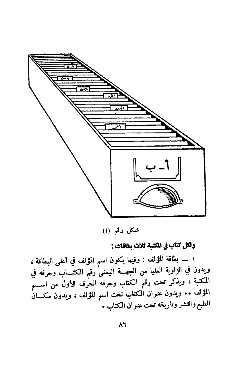 1- بطاقة المؤلف: وفيها يكون اسم المؤلف في أعلى البطاقات، ويدون في الزاوية العليا من الجهة اليمنى رقم الكتاب وحرفه في المكتبة، ويذكر تحت رقم الكتاب وحرفه الحرف الأول من اسم المؤلف.. ويدون عنوان الكتاب تحت اسم المؤلف، ويدون مكان الطبع والنشر وتاريخه تحت عنوان الكتاب.