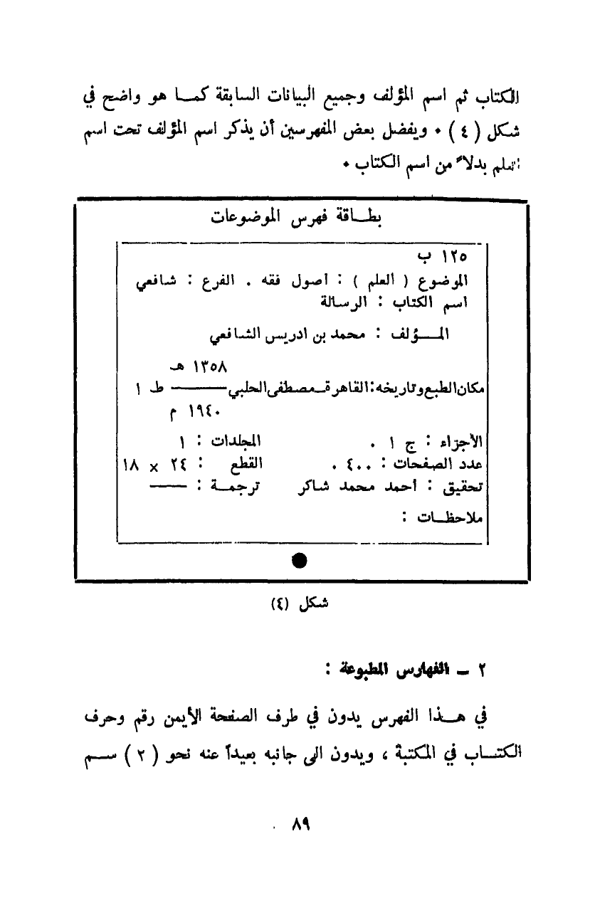 الكتاب ثم اسم المؤلف وجميع البيانات السابقة كما هو واضح في شكل4. ويفضل بعض المفهرسين أن يذكر اسم المؤلف تحت اسم العلم بدلًا من اسم الكتاب.