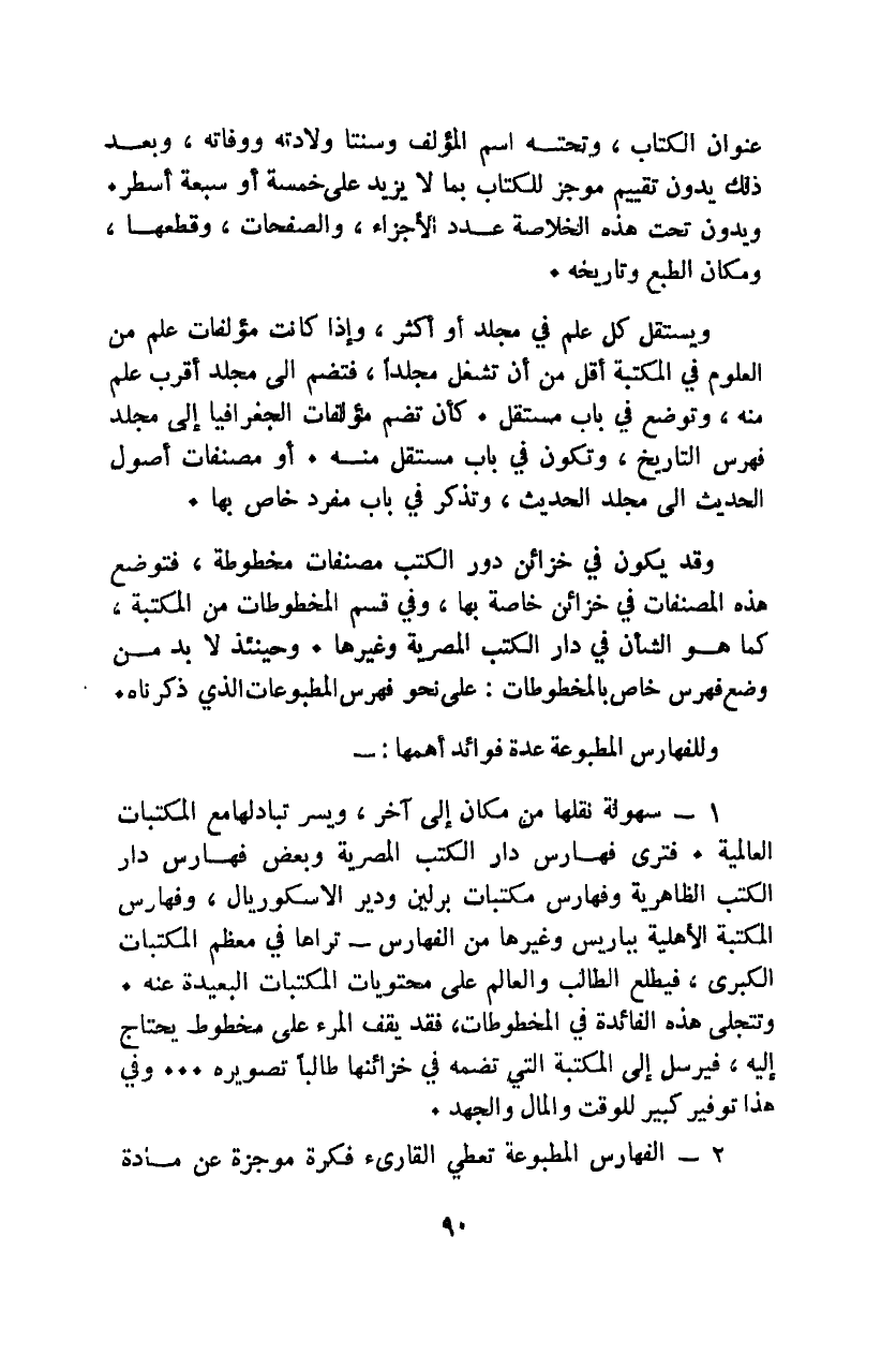 وقد يكون في خزائن دور الكتب مصنفات مخطوطة؛ فتوضع هذه المصنفات في خزائن خاصة بها، وفي قسم المخطوطات من المكتبة، كما هو الشأن في دار الكتب المصرية وغيرها. وحينئذ لا بد من وضع فهرس خاص بالمخطوطات: على نحو فهرس المطبوعات الذي ذكرناه.