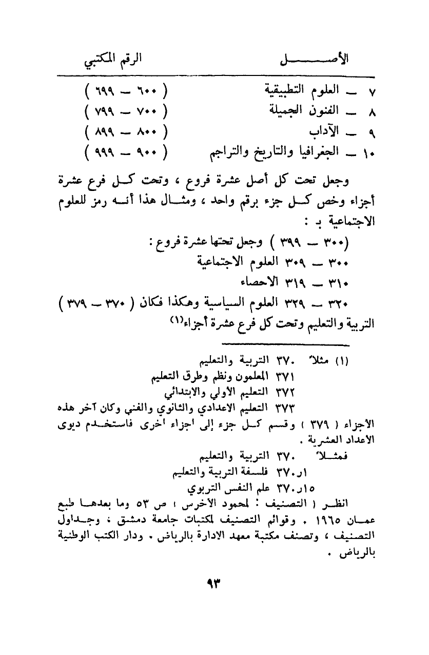 320 - 329 العلوم السياسية وهكذا فكان 370 - 379 التربية والتعليم وتحت كل فرع عشرة أجزاء1