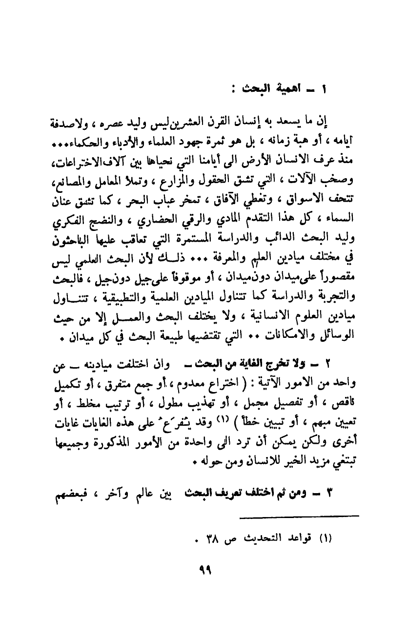 إن ما يسعد به إنسان القرن العشرين ليس وليد عصره، ولا صدفة أيامه، أو هبة زمانه؛ بل هو ثمرة جهود العلماء والأدباء والحكماء ... منذ عرف الإنسان الأرض إلى أيامنا التي نحياها بين آلاف الاختراعات، وصخب الآلات، التي تشق الحقول والزارع، وتملأ المعامل والمصانع، تتحف الأسواق، وتغطي الآفاق، تمخر عباب البحر، كما تشق عنان السماء، كل هذا التقدم المادي والرقي الحضاري، والنضج الفكري وليد البحث الدائب والدراسة المستمرة التي تعاقب عليها الباحثون في مختلف ميادين العلم والمعرفة؛ ذلك لأن البحث العلمي ليس مقصورًا على ميدان دون ميدان، أو موقوفًا على جيل دون جيل؛ فالبحث والتجربة والدراسة كما تتناول الميادين العلمية والتطبيقية، تتناول الوسائل والإمكانات التي تقتضيها طبيعة البحث في كل ميدان.