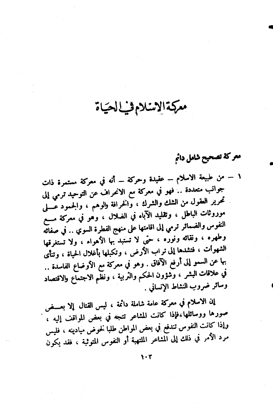 1- من طبيعة الإسلام -عقيدة وحركة- أنه في معركة مستمرة ذات جوانب متعددة.. فهو في معركة مع الانحراف عن التوحيد ترمي إلى تحرير العقول من الشك والشرك، والخرافة والوهم، والجمود على موروثات الباطل، وتقليد الآباء في الضلال، وهو في معركة مع النفوس والضمائر ترمي إلى إقامتها على منهج الفطرة السوي.. في صفائه وطهره، ونقائه ونوره، حتى لا تستبد بها الأهواء، ولا تستغرقها الشهوات، فتشدها إلى تراب الأرض، وتكبلها بأغلال الحياة، وتنأى بها عن السمو إلى أرفع الآفاق. وهو في معركة مع الأوضاع الفاسدة.. في علاقات البشر، وشئون الحكم والتربية، ونظم الاجتماع والاقتصاد، وسائر ضروب النشاط الإنساني.