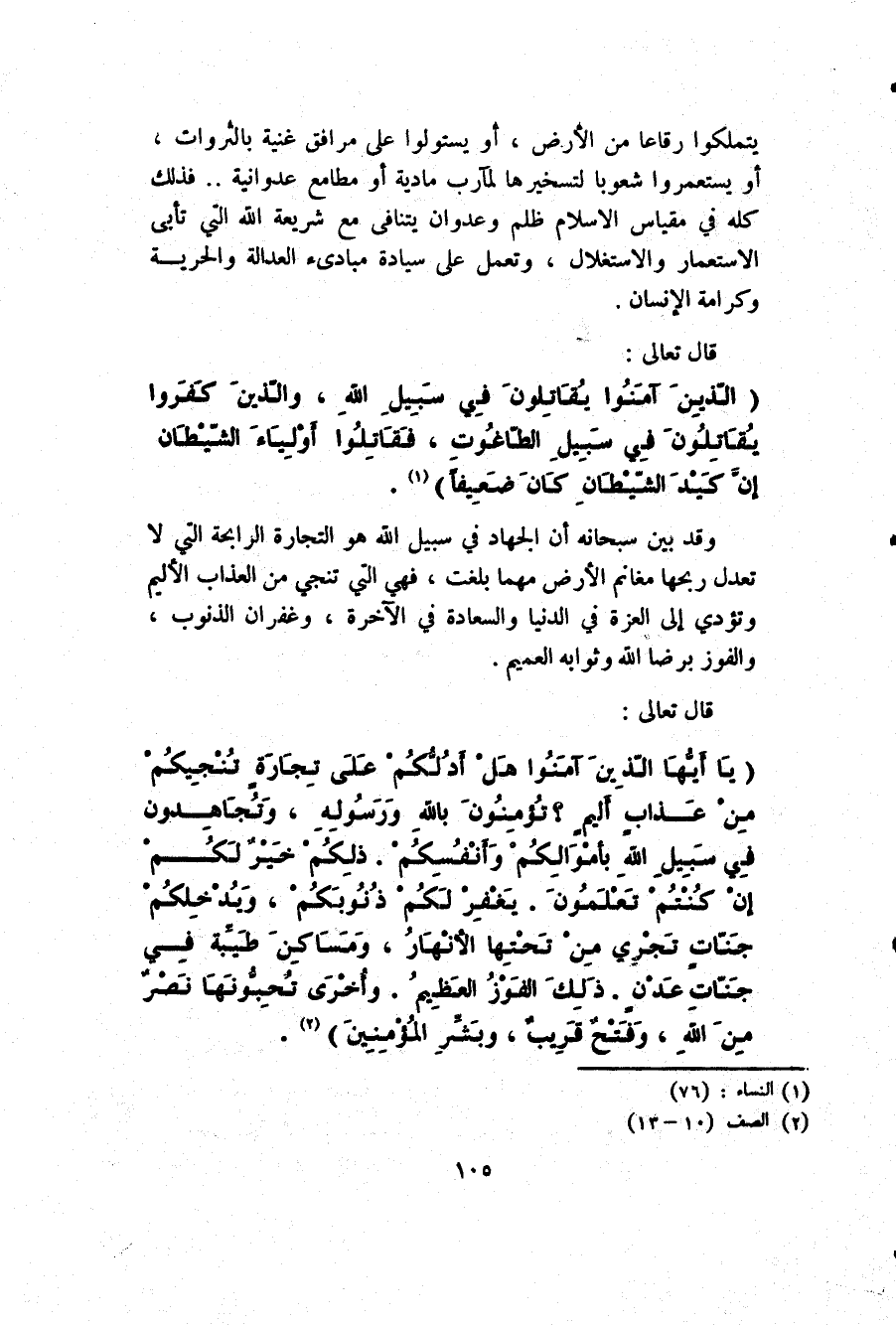 {يَا أَيُّهَا الَّذِينَ آمَنُوا هَلْ أَدُلُّكُمْ عَلَى تِجَارَةٍ تُنْجِيكُمْ مِنْ عَذَابٍ أَلِيمٍ، تُؤْمِنُونَ بِاللَّهِ وَرَسُولِهِ وَتُجَاهِدُونَ فِي سَبِيلِ اللَّهِ بِأَمْوَالِكُمْ وَأَنْفُسِكُمْ ذَلِكُمْ خَيْرٌ لَكُمْ إِنْ كُنْتُمْ تَعْلَمُونَ، يَغْفِرْ لَكُمْ ذُنُوبَكُمْ وَيُدْخِلْكُمْ جَنَّاتٍ تَجْرِي مِنْ تَحْتِهَا الْأَنْهَارُ وَمَسَاكِنَ طَيِّبَةً فِي جَنَّاتِ عَدْنٍ ذَلِكَ الْفَوْزُ الْعَظِيمُ، وَأُخْرَى تُحِبُّونَهَا نَصْرٌ مِنَ اللَّهِ وَفَتْحٌ قَرِيبٌ وَبَشِّرِ الْمُؤْمِنِينَ} 2.