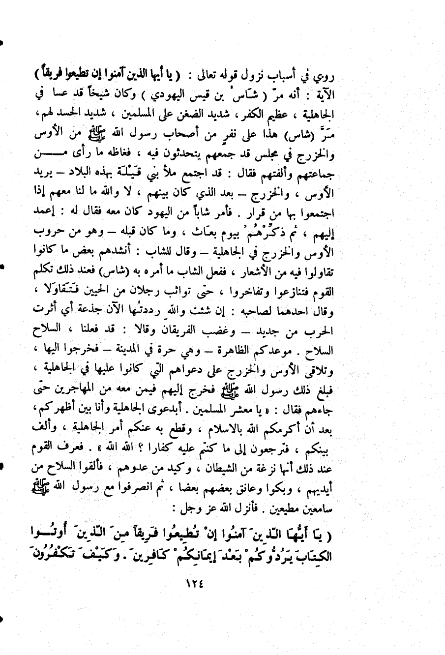 روي في أسباب نزول قوله تعالى: {يَا أَيُّهَا الَّذِينَ آمَنُوا إِنْ تُطِيعُوا فَرِيقاً} الآية: أنه مر "شاس بن قيس اليهودي" وكان شيخًا قد عمي في الجاهلية، عظيم الكفر، شديد الضغن على المسلمين، شديد الحسد لهم، مَرّ "شاس" هذا على نفرٍ من أصحاب رسول الله صلى الله عليه وسلم من الأوس والخزرج في مجلس قد جمعهم يتحدثون فيه، فغاظه ما رأى من جماعتهم وألفتهم فقال: قد اجتمع ملأ بني قَيْلَة بهذه البلاد -يريد الأوس، والخزرج- بعد الذي كان بينهم، لا والله ما لنا معهم إذا اجتمعوا بها من قرار. فأمر شابًا من اليهود كان معه فقال له: اعمد إليهم، ثم ذكِّرْهُم بيوم بعَاث، وما كان قبله -وهو من حروب الأوس والخزرج في الجاهلية - وقال الشاب: أنشدهم بعض ما كانوا تقاولوا فيه من الأشعار، ففعل الشاب ما أمره به "شاس" فعند ذلك تكلم القوم فتنازعوا وتفاخروا، حتى تواثب رجلان من الحيين فَتَقَاوَلا، وقال أحدهما لصاحبه: إن شئت والله رددتُها الآن جذعة، أي أثرت الحرب من جديد، وغضب الفريقان وقالا: قد فعلنا، السلاح السلاح. موعدكم الظاهر -وهي حرة في المدينة- فخرجوا إليها، وتلاقى الأوس والخزرج على دعواهم التي كانوا عليها في الجاهلية، فبلغ ذلك رسول الله صلى الله عليه وسلم فخرج إليهم فيمن معه من المهاجرين حتى جاءهم فقال: "يا معشر المسلمين، أبدعوى الجاهلية وأنا بين أظهركم، بعد أن أكرمكم الله بالإسلام، وقطع به عنكم أمر الجاهلية، وألف بينكم، فترجعون إلى ما كتنم عليه كفارًا؟ الله الله". فعرف القوم عند ذلك أنها نزغة من الشيطان، وكيد من عدوهم، فألقوا السلاح من أيديهم، وبكوا وعانق بعضهم بعضا، ثم انصرفوا مع رسول الله صلى الله عليه وسلم سامعين مطيعين. فأنزل الله عز وجل: