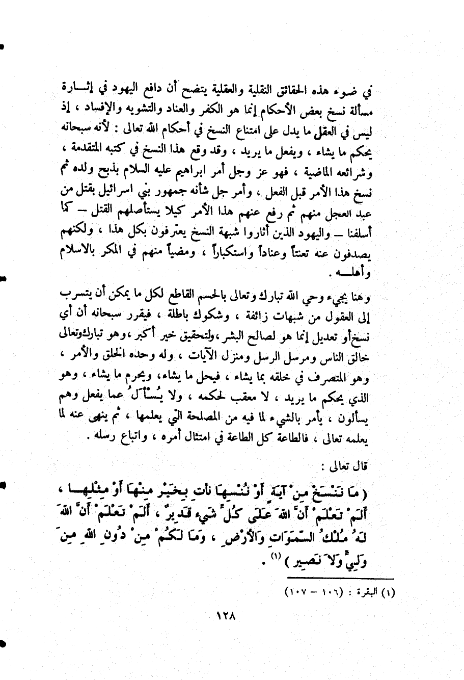 {مَا نَنْسَخْ مِنْ آيَةٍ أَوْ نُنْسِهَا نَأْتِ بِخَيْرٍ مِنْهَا أَوْ مِثْلِهَا أَلَمْ تَعْلَمْ أَنَّ اللَّهَ عَلَى كُلِّ شَيْءٍ قَدِيرٌ، أَلَمْ تَعْلَمْ أَنَّ اللَّهَ لَهُ مُلْكُ السَّمَاوَاتِ وَالْأَرْضِ وَمَا لَكُمْ مِنْ دُونِ اللَّهِ مِنْ وَلِيٍّ وَلا نَصِيرٍ} 1