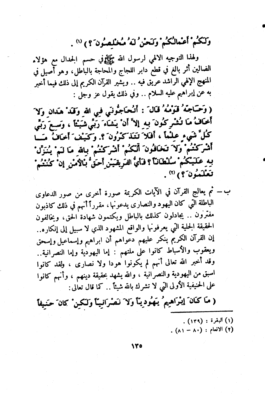ب- ثم يعالج القرآن في الآيات الكريمة صورة أخرى من صور الدعاوى الباطلة التي كان اليهود والنصارى يدعونها، مقررًا أنهم في ذلك كاذبون مفترون.. يجادلون كذلك بالباطل ويكتمون شهادة الحق، ويخالفون الحقيقة الجلية التي يعرفونها، والواقع المشهود الذي لا سبيل إلى إنكاره.. إن القرآن الكريم ينكر عليهم دعواهم أن إبراهيم وإسماعيل وإسحق ويعقوب والأسباط كانوا على ملتهم: إما اليهودية وإما النصرانية.. وقد أخبر الله تعالى أنهم لم يكونوا هودا ولا نصارى، ولقد كانوا أسبق من اليهودية والنصرانية، والله يشهد بحقيقة دينهم، وأنهم كانوا على الحنيفية الأولى التي لا تشرك بالله شيئًا.. كما قال تعالى: