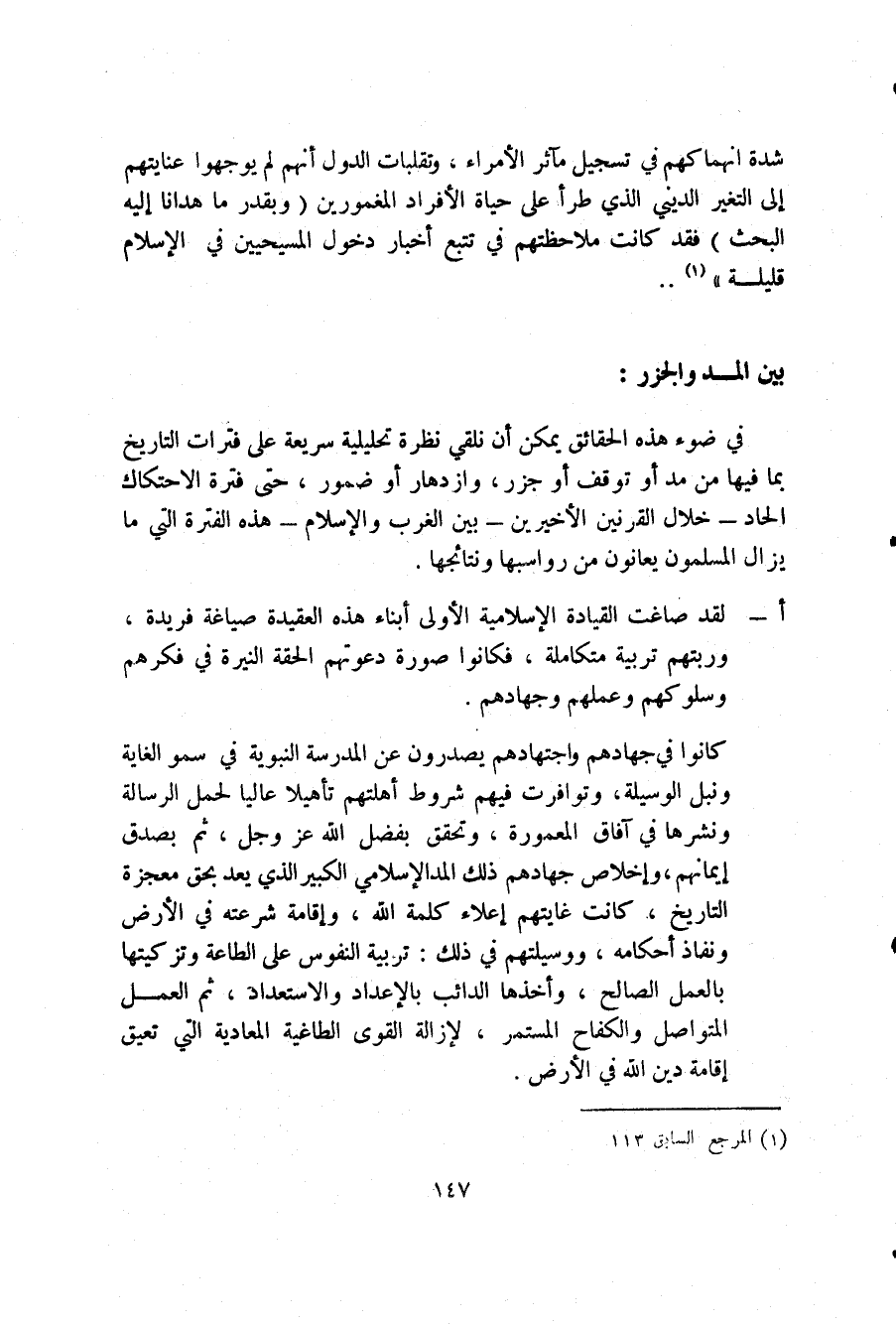 في ضوء هذه الحقائق يمكن أن نلقي نظرة تحليلية سريعة على فترات التاريخ بما فيها من مد أو توقف أو جزر، وازدهار أو ضمور، حتى فترة الاحتكاك الحاد، خلال القرنين الأخيرين، بين الغرب والإسلام، هذه الفترة التي لا يزال المسلمون يعانون من رواسبها ونتائجها.