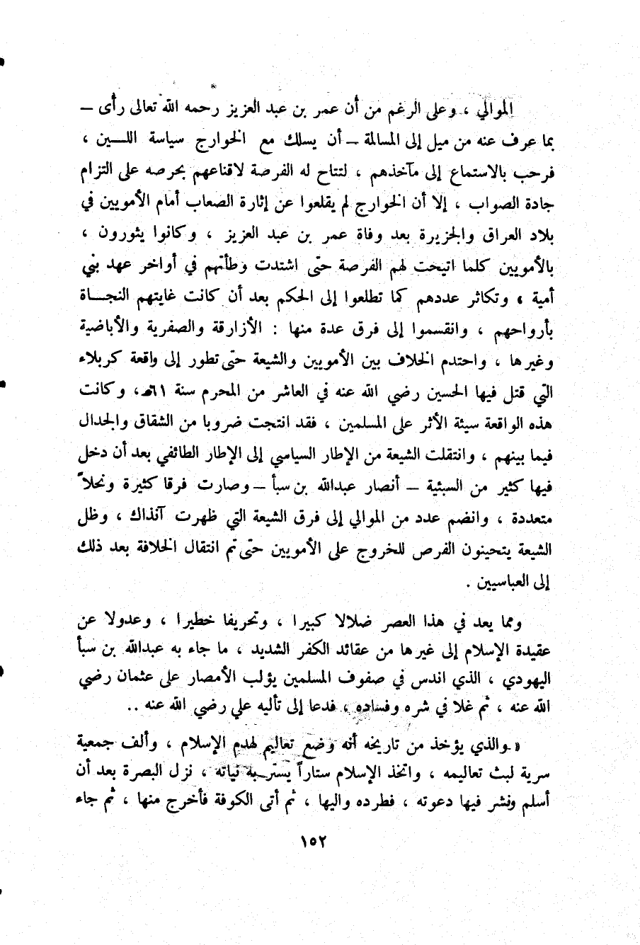 الموالي، وعلى الرغم من أن عمر بن عبد العزيز -رحمه الله تعالى- رأى -بما عرف عنه من ميل إلى المسالمة- أن يسلك مع الخوارج سياسة اللين، فرحب بالاستماع إلى مآخذهم، لتتاح له الفرصة لإقناعهم بحرصه على التزام جادة الصواب، إلا أن الخوارج لم يقلعوا عن إثارة الصعاب أمام الأمويين في بلاد العراق والجزيرة بعد وفاة عمر بن عبد العزيز، وكانوا يثورون بالأمويين كلما أتيحت لهم الفرصة حتى اشتدت وطأتهم في أواخر عهد بني أمية، وتكاثر عددهم كما تطلعوا إلى الحكم بعد أن كانت غايتهم النجاة بأرواحهم، وانقسموا إلى فرق عدة منه: الأزارقة والصفرية والإباضية وغيرها، واحتدم الخلاف بين الأمويين والشيعة حتى تطور إلى واقعة كربلاء التي قتل فيها الحسين -رضي الله عنه- في العاشر من المحرم سنة 61هـ، وكانت هذه الواقعة سيئة الأثر على المسلمين، فقد أنتجت ضروبا من الشقاق والجدال فيما بينهم، وانتقلت الشيعة من الإطار السياسي إلى الإطار الطائفي بعد أن دخل فيها كثير من السَّبئيَّة -أنصار عبد الله بن سبأ- وصارت فرقًا كثيرة ونحلًا متعددة، وانضم عدد من الموالي إلى فرق الشيعة التي ظهرت آنذاك، وظل الشيعة يتحينون الفرص للخروج على الأمويين حتى تم انتقال الخلافة بعد ذلك إلى العباسيين.