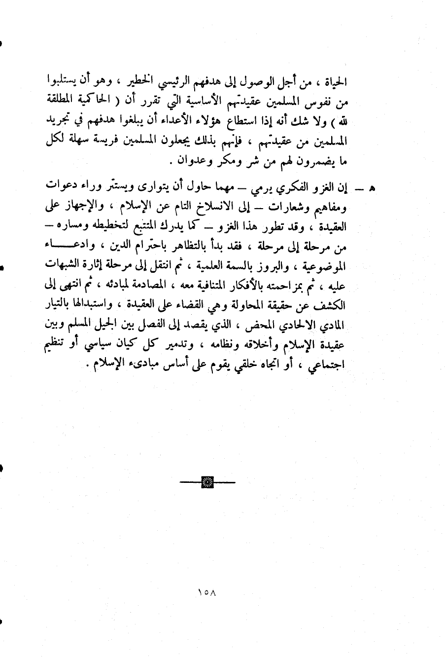 هـ - إن الغزو الفكري يرمي -مهما حاول أن يتوارى ويستتر وراء دعوات ومفاهيم وشعارات- إلى الانسلاخ التام عن الإسلام، والإجهاز على العقيدة، وقد تطور هذا الغزو -كما يدرك المتتبع لتخطيطه ومساره- من مرحلة إلى مرحلة، فقد بدأ بالتظاهر باحترام الدين، وادعاء الموضوعية، والبروز بالسمة العلمية، ثم انتقل إلى مرحلة إثارة الشبهات عليه، ثم بمزاحمته بالأفكار المتنافية معه، المصادمة لمبادئه، ثم انتهى إلى الكشف عن حقيقة المحاولة وهي القضاء على العقيدة، واستبدالها بالتيار المادي الإلحادي المحض، الذي يقصد إلى الفصل بين الجيل المسلم وبين عقيدة الإسلام وأخلاقه ونظامه، وتدمير كل كيان سياسي أو تنظيم اجتماعي، أو اتجاه خلقي يقوم على أساس مبادئ الإسلام.