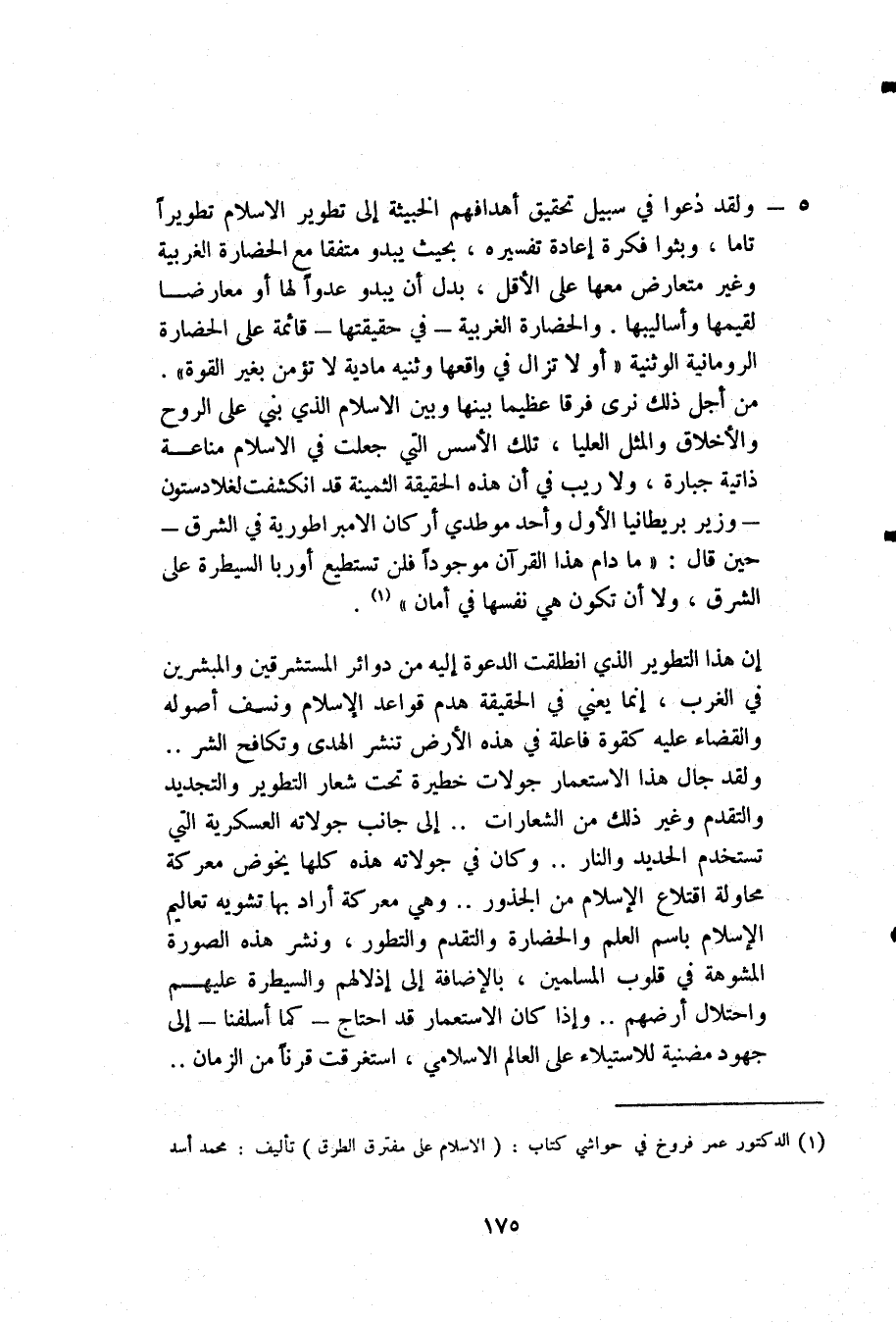 1 الدكتور عمر فروخ في حواشي كتاب: "الإسلام على مفترق الطرق" تأليف: محمد أسد ص41.