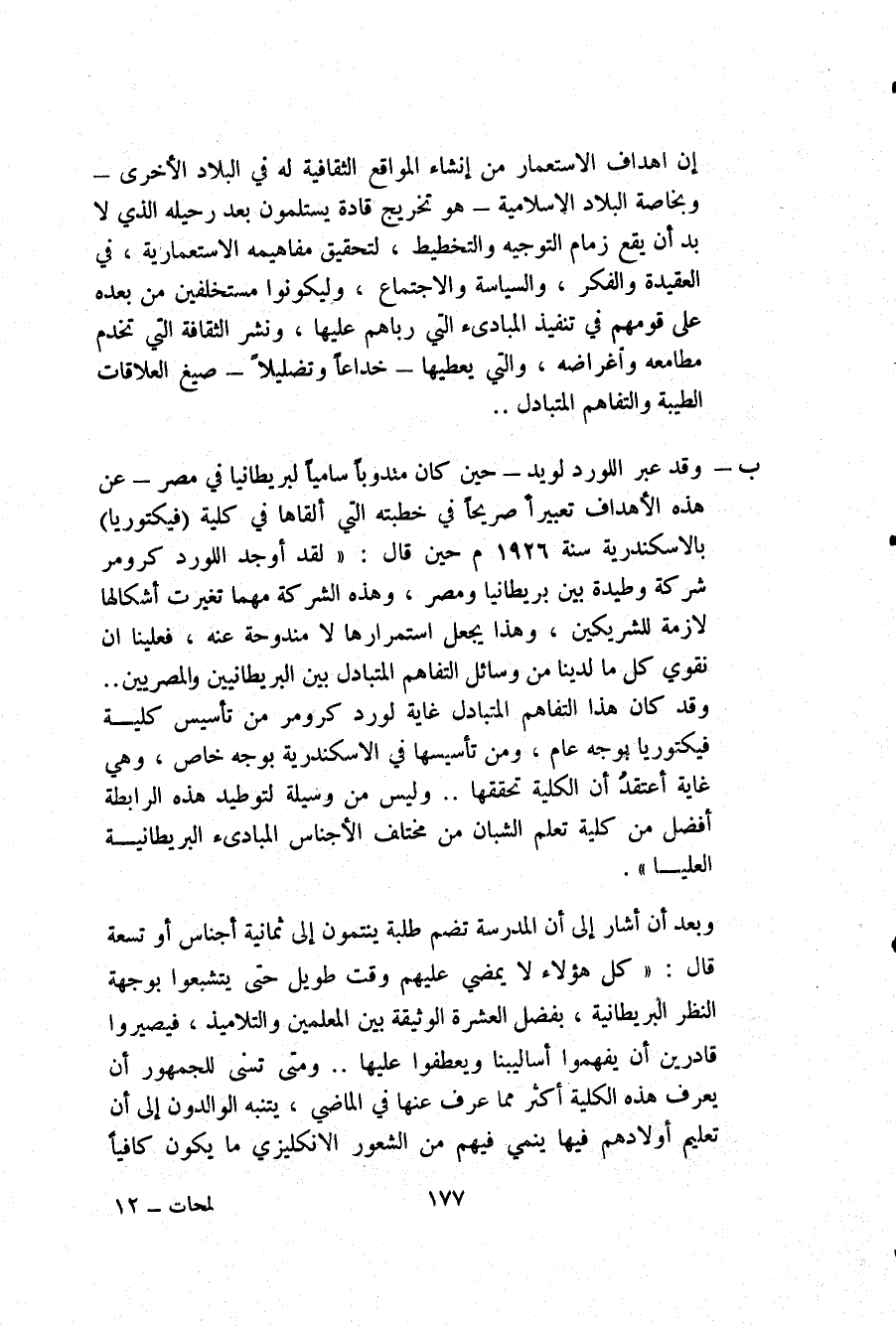 ب- وقد عبر اللورد لويد -حين كان مندوبًا ساميًا لبريطانيا في مصر- عن هذه الأهداف تعبيرًا صريحًا في خطبته التي ألقاها في كلية "فيكتوريا" بالإسكندرية سنة 1926م حين قال: "لقد أوجد اللورد كرومر شركة وطيدة بين بريطانيا ومصر، وهذه الشركة مهما تغيرت أشكالها لازمة للشريكين، وهذا يجعل استمرارها لا مندوحة عنه، فعلينا أن نقوي كل ما لدينا من وسائل التفاهم المتبادلة بين البريطانيين والمصريين.. وقد كان هذا التفاهم المتبادل غاية لورد كرومر من تأسيس كلية فيكتوريا بوجه عام، ومن تأسيسها في الإسكندرية بوجه خاص، وهي غاية أعتقد أن الكلية تحققها.. وليس من وسيلة لتوطيد هذه الرابطة أفضل من كلية تعلم الشبان من مختلف الأجناس المبادئ البريطانية العليا".