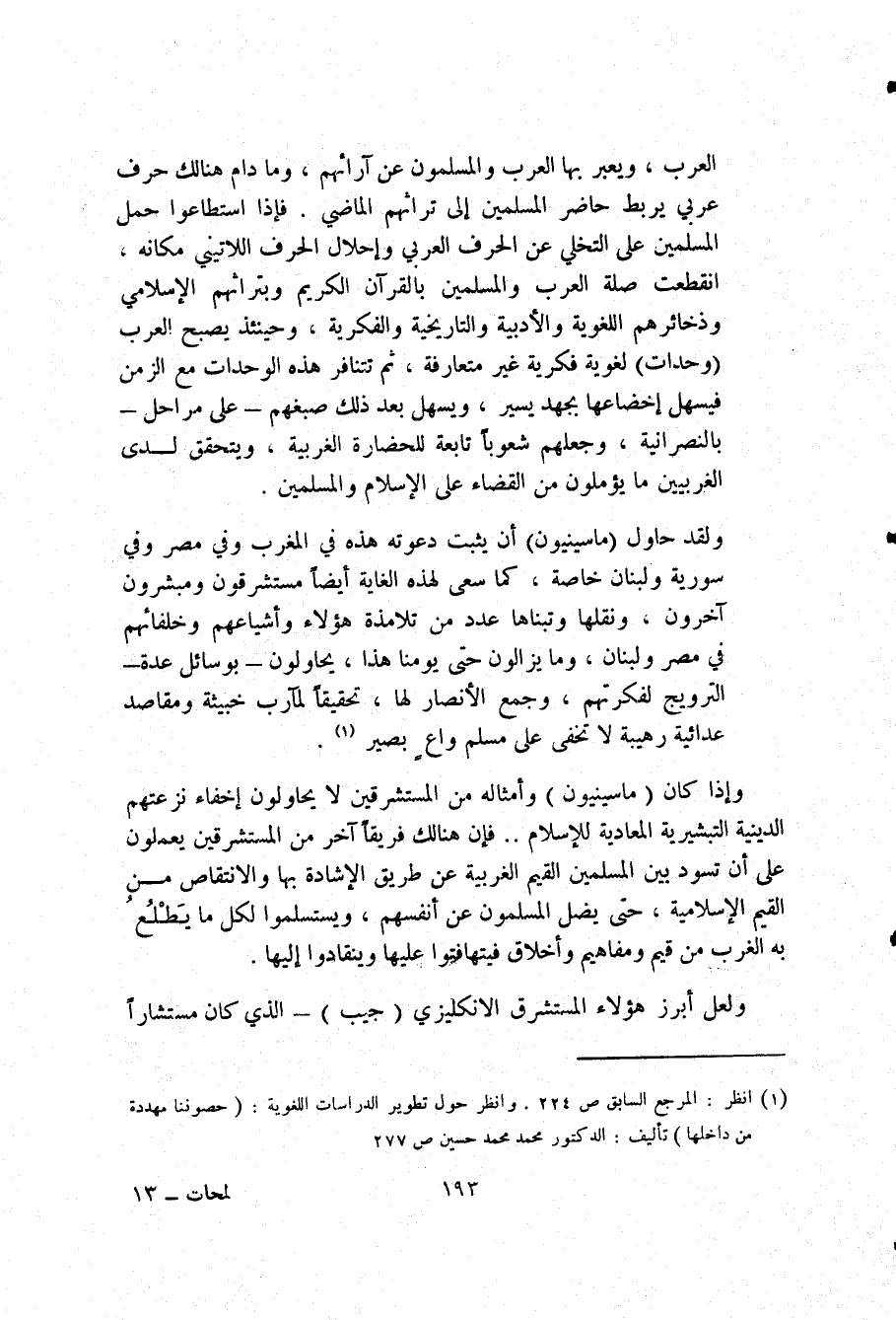 العرب، ويعبر بها العرب والمسلمون من آرائهم، وما دام هنالك حرف عربي يربط حاضر المسلمين إلى تراثهم الماضي، فإذا استطاعوا حمل المسلمين على التخلي عن الحرف العربي وإحلال الحرف اللاتيني مكانه، انقطعت صلة العرب والمسلمين بالقرآن الكريم وبتراثهم الإسلامي وذخائرهم اللغوية والأدبية والتاريخية والفكرية، وحينئذ يصبح العرب "وحدات" لغوية فكرية غير متعارفة، ثم تتنافر هذه الوحدات مع الزمن فيسهل إخضاعها بجهد يسير، ويسهل بعد ذلك صبغهم -على مراحل- بالنصرانية، وجعلهم شعوبًا تابعة للحضارة الغربية، ويتحقق لدى الغربيين ما يؤملون من القضاء على الإسلام والمسلمين.