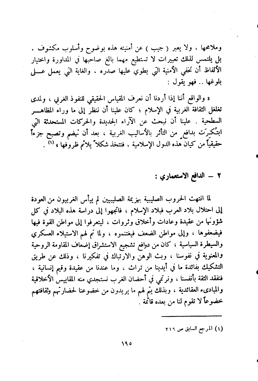 وملامحها. ولا يعبر "جيب" عن أمنيته هذه بوضوح وأسلوب مكشوف، بل يلتمس لذلك تعبيرات لا تستطيع مهما بالغ صاحبها في المداورة واختيار الألفاظ أن تخفي الأمنية التي يطوي عليها صدره، والغاية التي يعمل على بلوغها.. فهو يقول: "والواقع أننا إذا أردنا أن نعرف المقياس الحقيقي للنفوذ الغربي، ولمدى تغلغل الثقافة الغربية في الإسلام، كان علينا أن ننظر إلى ما وراء المظاهر السطحية. علينا أن نبحث عن الآراء الجديدة والحركات المستحدثة التي ابتُكِرَتْ بدافعٍ من التأثير بالأساليب الغربية، بعد أن تهضم وتصبح جزءًا حقيقيًا من كيان هذه الدول الإسلامية، فتتخذ شكلاً يلائم ظروفها"1