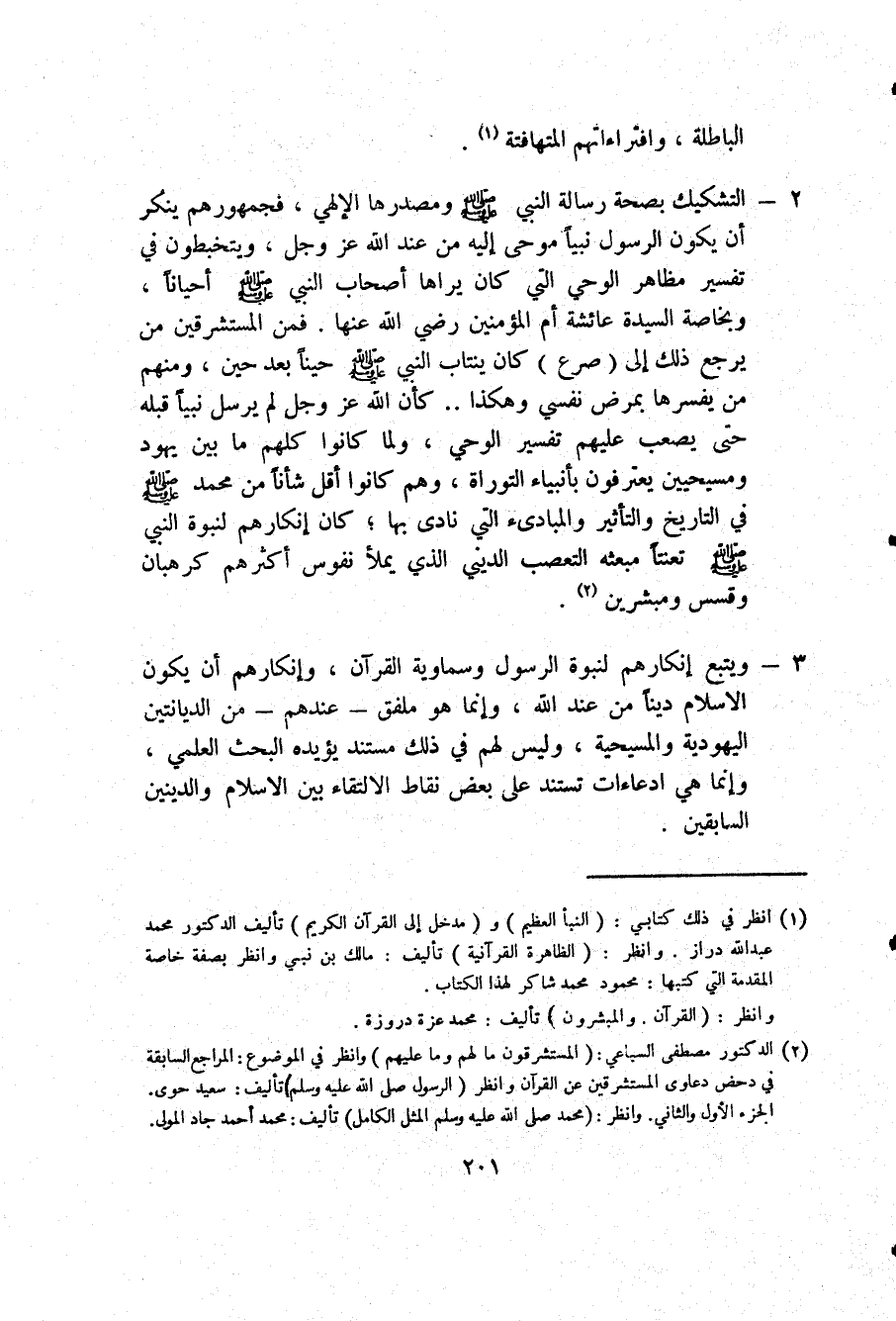 2 الدكتور مصطفى السباعي: "المستشرقون ما لهم وما عليهم"، وانظر في الموضوع: المراجع السابقة في دحض دعاوى المستشرقين عن القرآن وانظر "الرسول صلى الله عليه وسلم" تأليف: سعيد حوى، الجزء الأول والثاني. وانظر: "محمد صلى الله عليه وسلم المثل الكامل" تأليف: محمد أحمد جاد المولى.