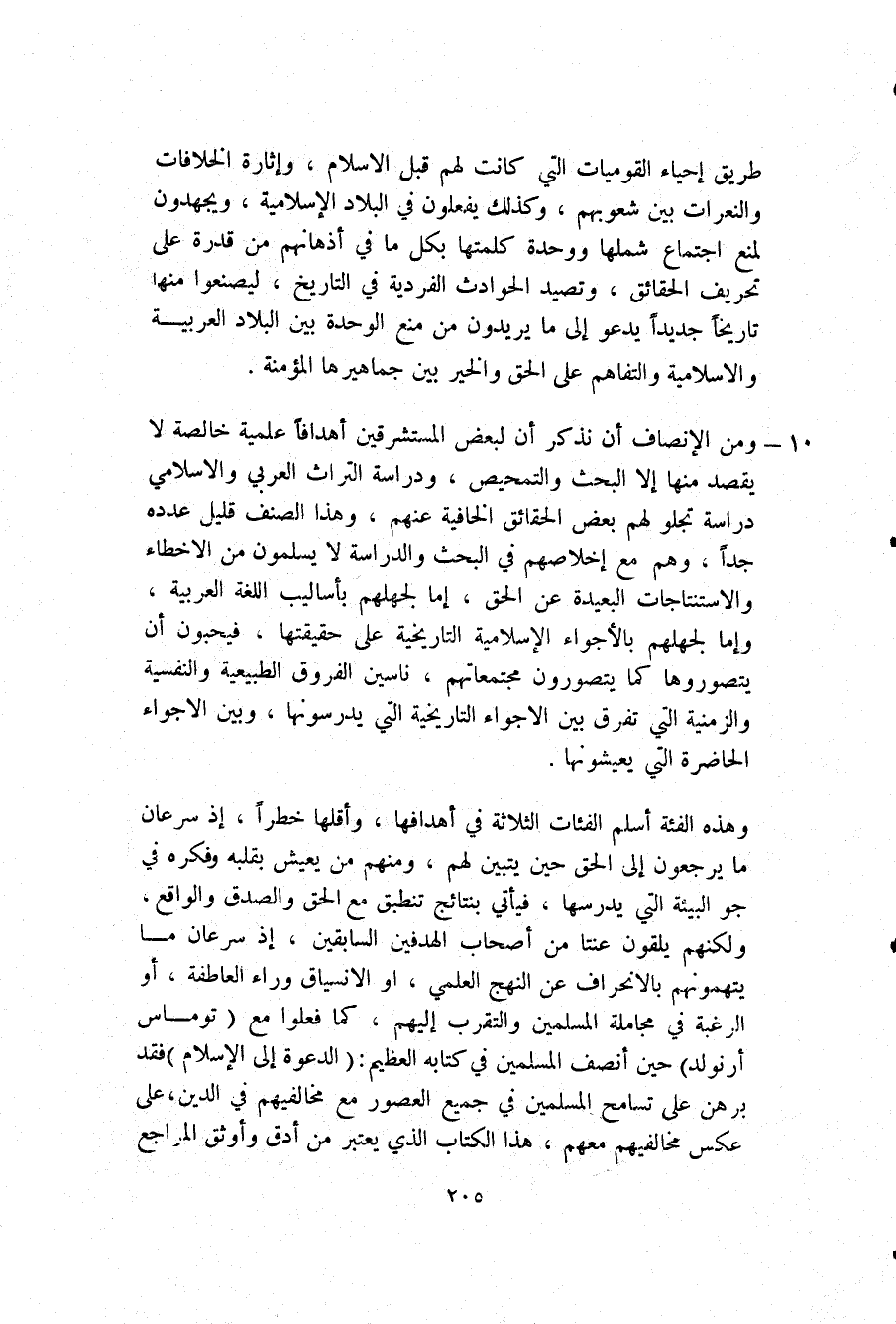 10- ومن الإنصاف أن نذكر أن لبعض المستشرقين أهدافًا علمية خالصة لا يقصد منها إلا البحث والتمحيص، ودراسة التراث العربي والإسلامي دراسة تجلو لهم بعض الحقائق الخافية عنهم، وهذا الصنف قليل عدده جدًّا، وهم مع إخلاصهم في البحث والدراسة لا يسلمون من الأخطاء والاستنتاجات البعيدة عن الحق، إما لجهلهم بأساليب اللغة العربية، وإما لجهلهم بالأجواء الإسلامية التاريخية على حقيقتها، فيحبون أن يتصوروها كما يتصورون مجتمعاتهم، ناسين الفروق الطبيعية والنفسية والزمنية التي تفرق بين الأجواء التاريخية التي يدرسونها، وبين الأجواء الحاضرة التي يعيشونها.