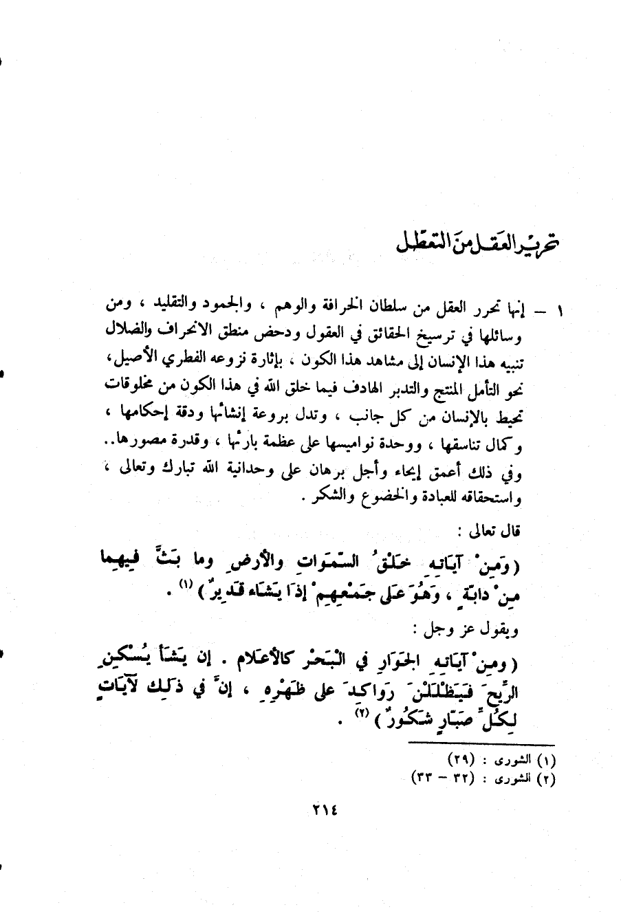 1- إنها تحرر العقل من سلطان الخرافة والوهم، والجمود والتقليد، ومن وسائلها في ترسيخ الحقائق في العقول ودحض منطق الانحراف والضلال تنبيه هذا الإنسان إلى مشاهد هذا الكون، بإثارة نزوعه الفطري الأصيل، نحو التأمل المنتج والتدبر الهادف فيما خلق الله في هذا الكون من مخلوقات تحيط بالإنسان من كل جانب، وتدل بروعة إنشائها ودقة إحكامها، وكمال تناسقها، ووحدة نواميسها على عظمة بارئها، وقدرة مصورها، وفي ذلك أعمق إيحاء وأجل برهان على وحدانية الله تبارك وتعالى، واستحقاقه للعبادة والخضوع والشكر.