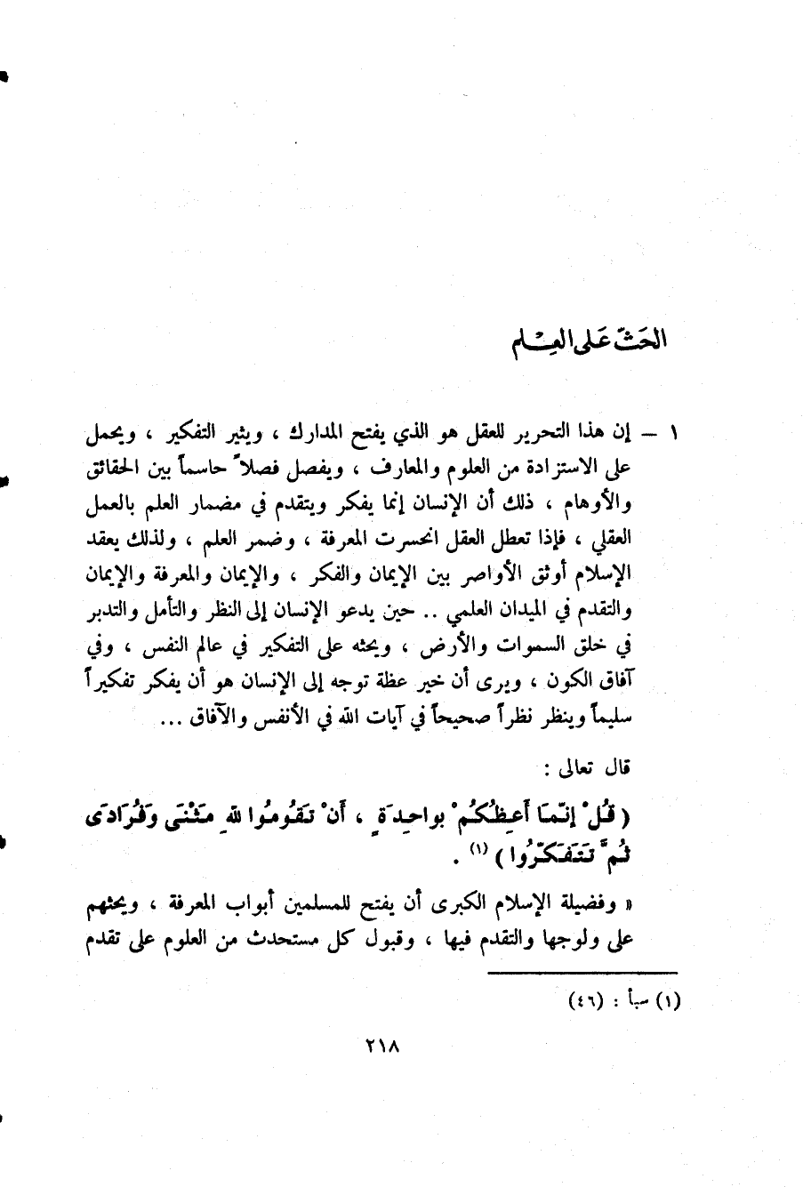 "وفضيلة الإسلام الكبرى أن يفتح للمسلمين أبواب المعرفة، ويحثهم على ولوجها والتقدم فيها، وقبول كل مستحدث من العلوم على تقدم
