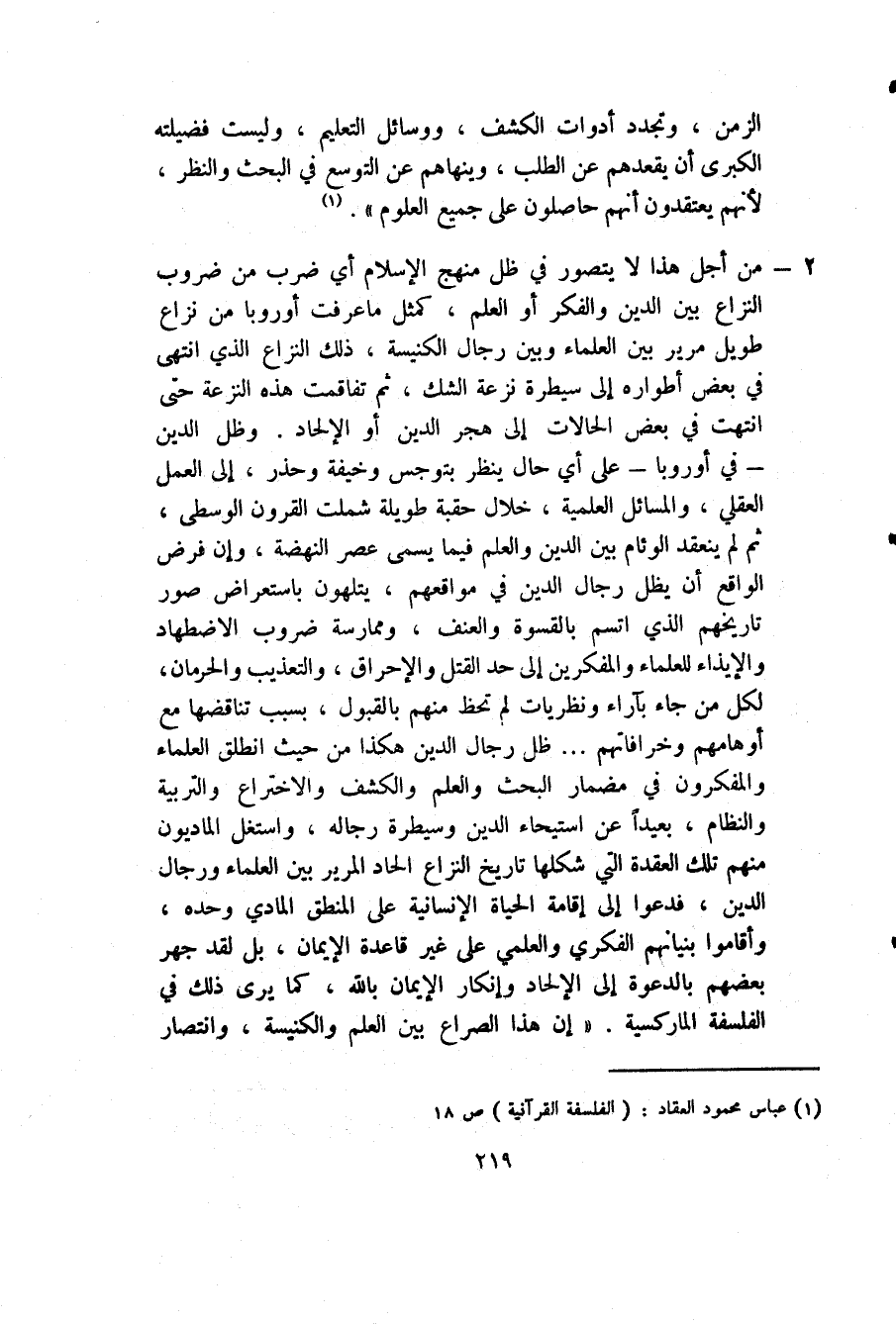 2- من أجل هذا لا يتصور في ظل منهج الإسلام أي ضرب من ضروب النزاع بين الدين والفكر أو العلم، كمثل ما عرفت أوروبا من نزاع طويل مرير بين العلماء وبين رجال الكنيسة، ذلك النزاع الذي انتهى في بعض أطواره إلى سيطرة نزعة الشك، ثم تفاقمت هذه النزعة حتى انتهت في بعض الحالات إلى هجر الدين أو الإلحاد، وظل الدين -في أوروبا- على أي حال ينظر بتوجس وخيفة وحذر، إلى العمل العقلي، والمسائل العلمية، خلال حقبة طويلة شملت القرون الوسطى، ثم لم ينعقد الوئام بين الدين والعلم فيما يسمى عصر النهضة، وإن فرض الواقع أن ظل رجال الدين في مواقعهم، يتلهون باستعراض صور تاريخهم الذي اتسم بالقسوة والعنف، وممارسة ضروب الاضطهاد والإيذاء للعلماء والمفكرين إلى حد القتل والإحراق، والتعذيب والحرمان، لكل من جاء بآراء ونظريات لم تحظَ منهم بالقبول، بسبب تناقضها مع أوهامهم وخرافاتهم.. ظل رجال الدين هكذا من حيث انطلق العلماء والمفكرون في مضمار البحث والعلم والكشف والاختراع والتربية والنظام، بعيدًا عن استيحاء الدين وسيطرة رجاله، واستغل الماديون منهم تلك العقدة التي شكلها تاريخ النزاع الحاد المرير بين العلماء ورجال الدين، فدعوا إلى إقامة الحياة الإنسانية على المنطق المادي وحده، وأقاموا بنيانهم الفكري والعلمي على غير قاعدة الإيمان، بل لقد جهر بعضهم بالدعوة إلى الإلحاد وإنكار الإيمان بالله، كما يرى ذلك في الفلسفة الماركسية. "إن هذا الصراع بين العلم والكنيسة، وانتصار