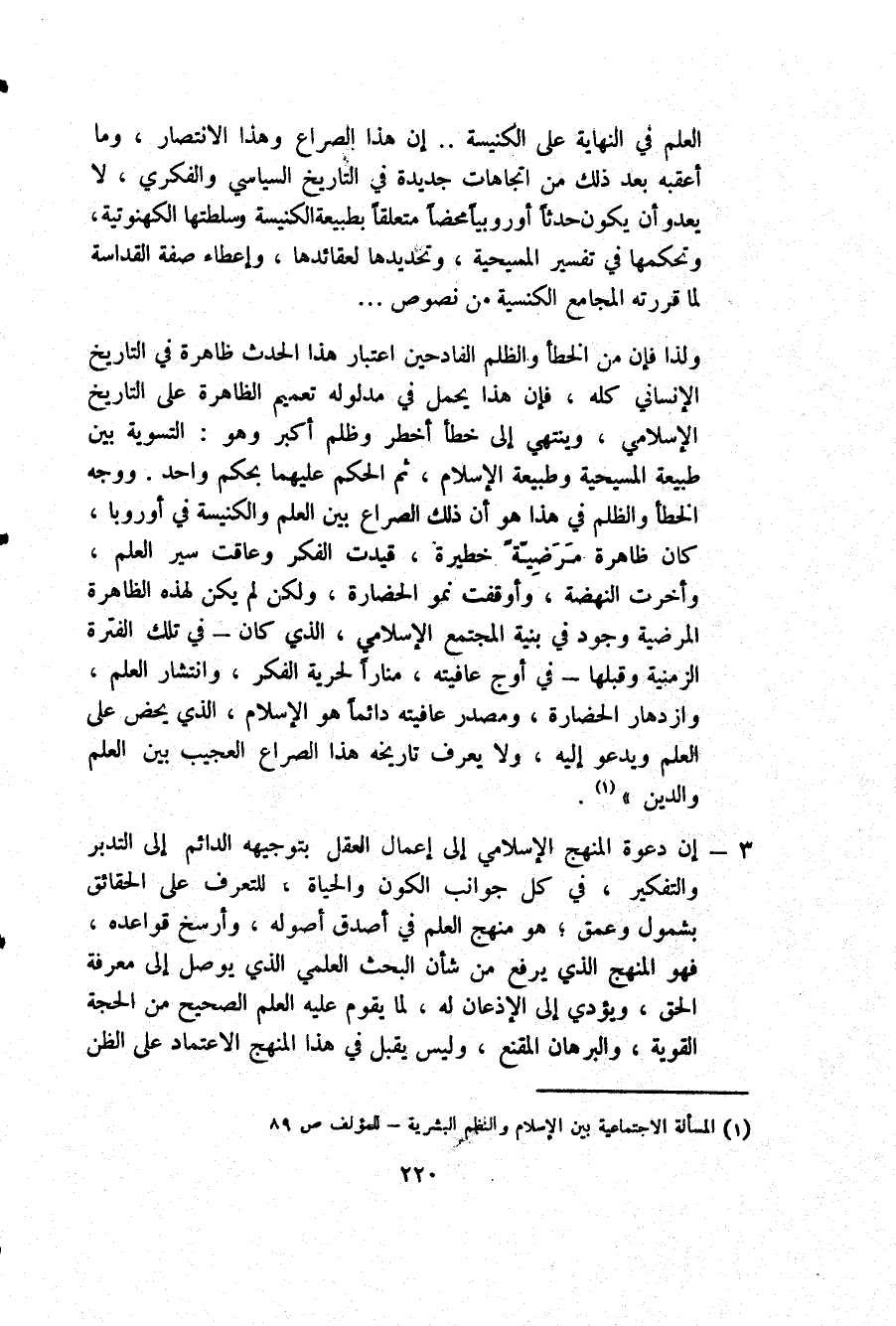 ولذا فإن الخطأ والظلم الفادحين اعتبار هذا الحدث في التاريخ الإنساني كله، فإن هذا يحمل في مدلوله تعميم الظاهرة على التاريخ الإسلامي، وينتهي إلى خطأ أخطر وظلم أكبر وهو: التسوية بين طبيعة المسيحية وطبيعة الإسلام، ثم الحكم عليهما بحكم واحد. ووجه الخطأ والظلم في هذا هو أن ذلك الصراع بين العلم والكنيسة في أوروبا، كان ظاهرة مَرَضِيَّةً خطيرة، قيدت الفكر وعاقت سير العلم، وأخرت النهضة، وأوقفت نمو الحضارة، ولكن لم يكن لهذه الظاهرة المرضية وجود في بنية المجتمع الإسلامي، الذي كان -في تلك الفترة الزمنية وقبلها- في أوج عافيته، منارًا لحرية الفكر، وانتشار العلم، وازدهار الحضارة، ومصدر عافيته دائمًا هو الإسلام، الذي يحض على العلم ويدعو إليه، ولا يعرف تاريخه هذا الصراع العجيب بين العلم والدين"1.