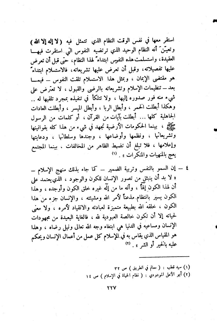استقر معها في نفس الوقت النظام الذي تتمثل فيه "لا إله إلا الله" وتَعَيَّنَ أنه النظام الوحيد الذي ترتضيه النفوس التي استقرت فيها العقيدة واستسلمت هذه النفوس ابتداءً لهذا النظام، حتى قبل أن تعرض عليها تفصيلاته، وقبل أن تعرض عليها تشريعاته، فالاستسلام ابتداء هو مقتضى الإيمان، وبمثل هذا الاستسلام تلقت النفوس -فيما بعد- تنظيمات الإسلام وتشريعاته بالرضى والقبول، لا تعترض على شيء منه فور صدوره إليها، ولا تتلكأ في تنفيذه بمجرد تلقيها له.. وهكذا أبطلت الخمر، وأبطل الربا، وأبطل الميسر، وأبطلت العادات الجاهلية كلها.. أبطلت بآيات من القرآن، أو كلمات من الرسول -صلى الله عليه وسلم- بينما الحكومات الأرضية تجهد في شيء من هذا كله بقوانينها وتشريعاتها، ونظمها وأوضاعها، وجندها وسلطاتها، ودعايتها وإعلامها، فلا تبلغ أن تضبط الظاهر من المخالفات، بينما المجتمع يعج بالمنهيات والمنكرات"1.
