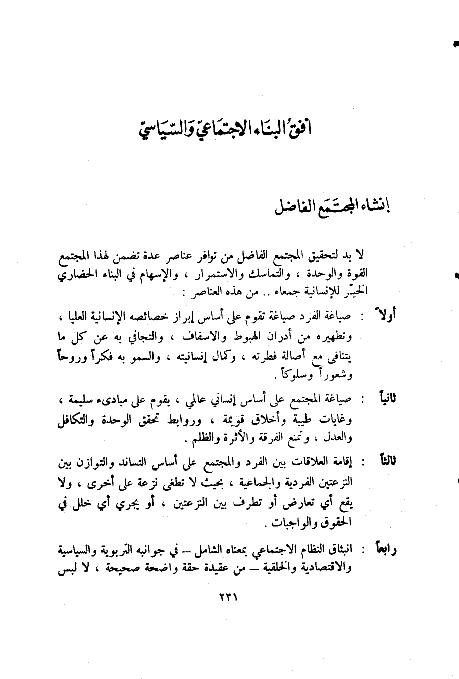 أولا: صياغة الفرد صياغة تقوم على أساس إبراز خصائصه الإنسانية العليا، وتطهيره من أدران الهبوط والإسفاف، والتجافي به عن كل ما يتنافى مع أصالة فطرته، وكمال إنسانيته، والسمو به فكرًا وروحًا وشعورًا وسلوكًا.