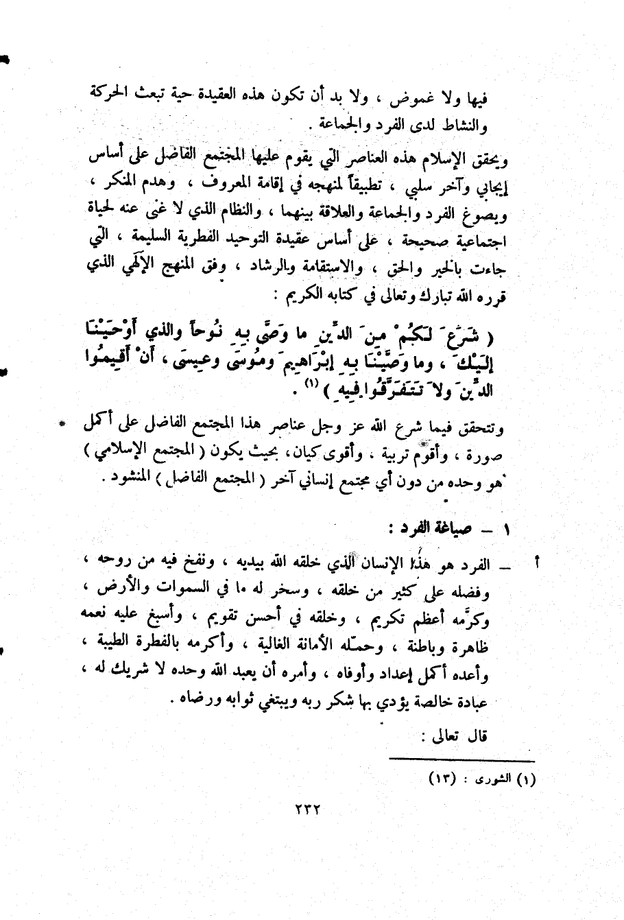 ويحقق الإسلام هذه العناصر التي يقوم عليها المجتمع الفاضل على أساس إيجابي وآخر سلبي، تطبيقًا لمنهجه في إقامة المعروف، وهدم المنكر، ويصوغ الفرد والجماعة والعلاقة بينهما، والنظام الذي لا غنى عنه لحياة اجتماعية صحيحة، على أساس عقيدة التوحيد الفطرية السليمة، التي جاءت بالخير والحق، والاستقامة والرشاد، وفق المنهج الإلهي الذي قرره الله تبارك تعالى في كتابه الكريم: {شَرَعَ لَكُمْ مِنَ الدِّينِ مَا وَصَّى بِهِ نُوحًا وَالَّذِي أَوْحَيْنَا إِلَيْكَ وَمَا وَصَّيْنَا بِهِ إِبْرَاهِيمَ وَمُوسَى وَعِيسَى أَنْ أَقِيمُوا الدِّينَ وَلا تَتَفَرَّقُوا فِيهِ} 1.