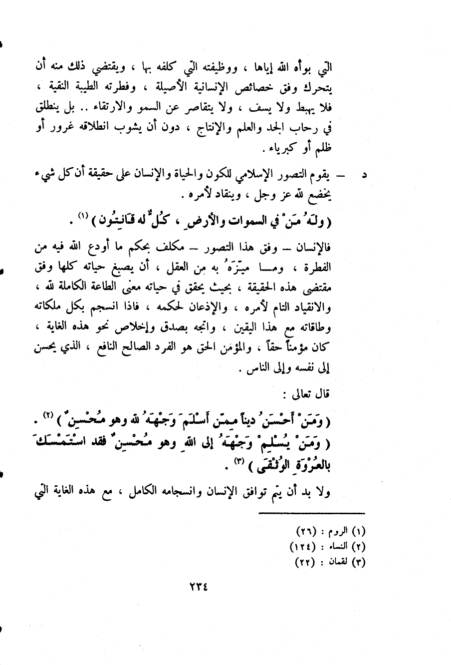 التي بوأه الله إياها، ووظيفته التي كلفه بها، ويقتضي ذلك منه أن يتحرك وفق خصائص الإنسانية الأصيلة، وفطرته الطيبة النقية، فلا يهبط ولا يسف، ولا يتقاصر عن السمو والارتقاء، بل ينطلق في رحاب الجد والعلم والإنتاج، دون أن يشرب انطلاقه غرور أو ظلم أو كبرياء.