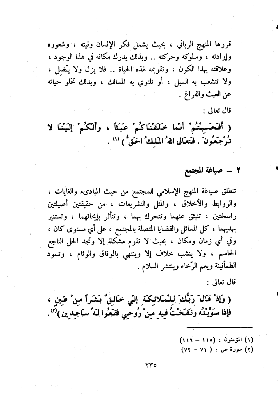 تنطلق صياغة المنهج الإسلامي للمجتمع من حيث المبادئ والغايات، والروابط والأخلاق، والمثل والتشريعات، من حقيقتين أصيلتين راسختين، تنبثق عنهما وتتحرك بهما، وتتأثر بإيحائهما، وتستنير بهديهما كل المسائل والقضايا المتصلة بالمجتمع على أي مستوى كان، وفي أي زمان ومكان، بحيث لا تقوم مشكلة إلا وتجد الحل الناجع الحاسم، ولا ينشب خلاف إلا وينتهي بالوفاق والوئام، وتسود الطمأنينة ويعم الرخاء وينتشر السلام.