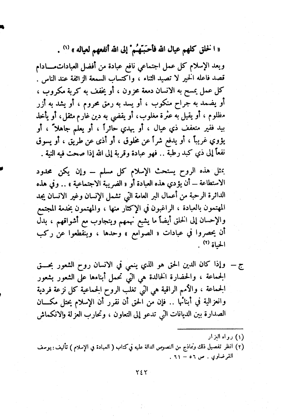 بمثل هذه الروح يستحث الإسلام كل مسلم -وإن يكن محدود الاستطاعة- أن يؤدي هذه العبادة أو "الضريبة الاجتماعية".. وفي هذه الدائرة الرحبة من أعمال البر العامة التي تشمل الإنسان وغير الإنسان يجد المهتمون بالعبادة، الراغبون في الإكثار منها، والمهتمون بخدمة المجتمع والإحسان إلى الخلق أيضًا ما يشبع نهمهم ويتجاوب مع أشواقهم، بدل أن يحصروا في عبادات "الصوامع" وحدها، وينقطعوا عن ركب الحياة2.