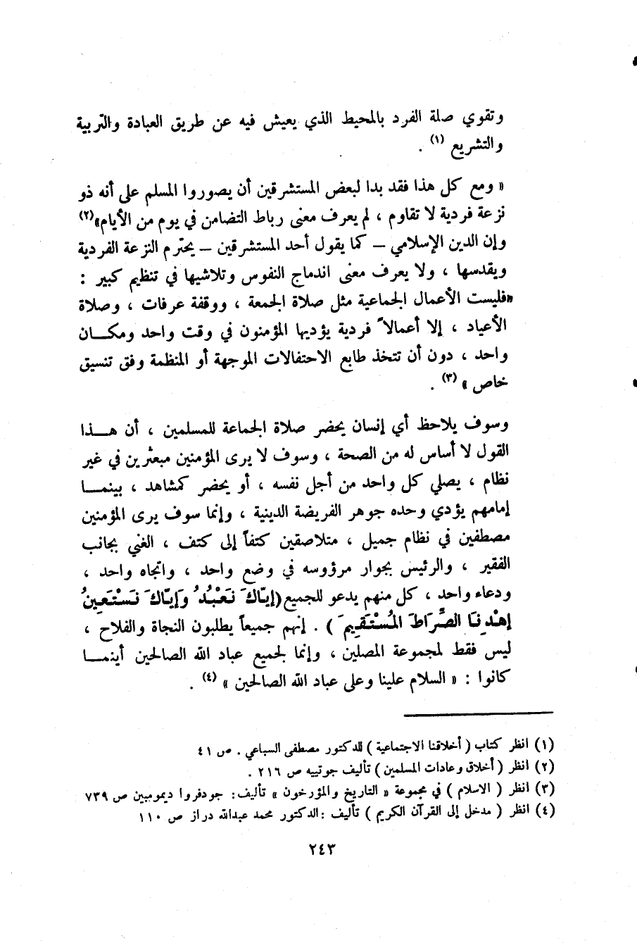 "ومع كل هذا فقد بدا لبعض المستشرقين أن يصوروا المسلم على أنه ذو نزعة فردية لا تقاوم، لم يعرف معنى رباط التضامن في يوم من الأيام"2 وإن الدين الإسلامي -كما يقول أحد المستشرقين- يحترم النزعة الفردية ويقدسها، ولا يعرف معنى اندماج النفوس وتلاشيها في تنظيم كبير: "فليست الأعمال الجماعية مثل صلاة الجمعة، ووَقْفَة عرفات، وصلاة الأعياد، إلا أعمالاً فردية يؤديها المؤمنون في وقت واحد ومكان واحد، دون أن تتخذ طابع الاحتفالات الموجهة أو المنظمة وفق تنسيق خاص"3.