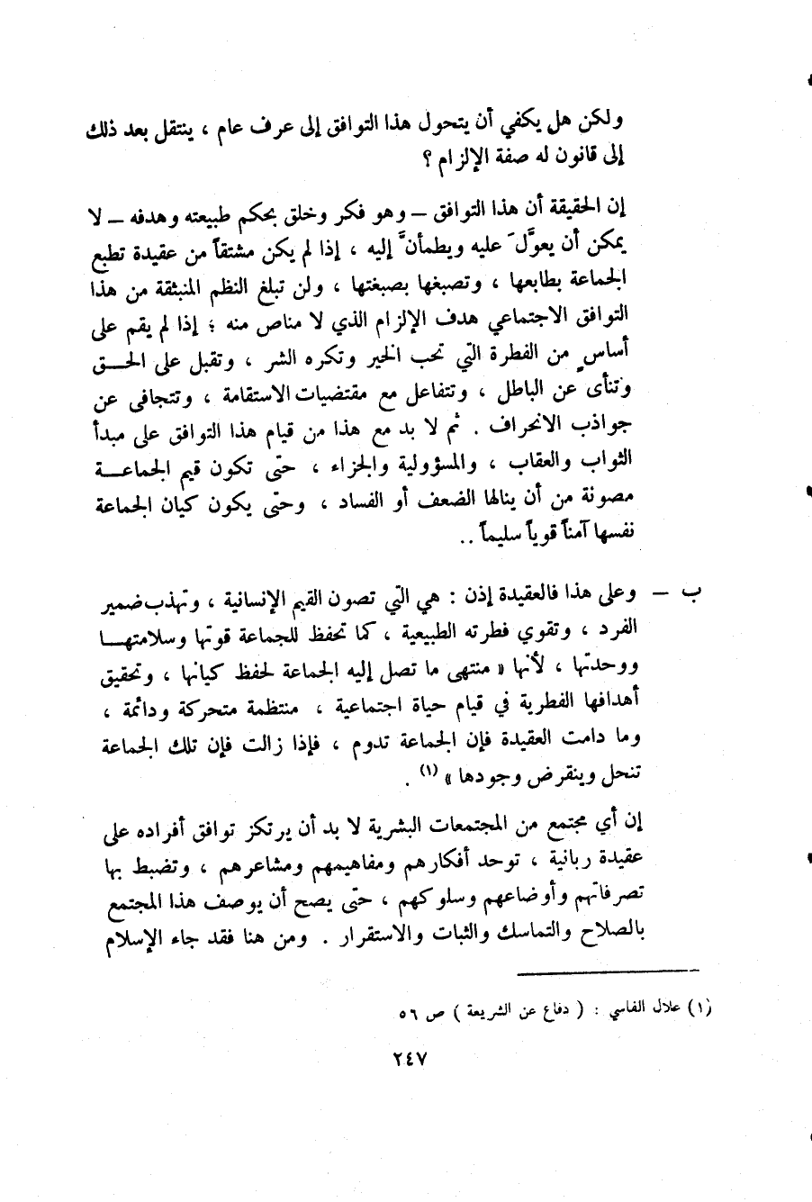 إن الحقيقة أن هذا التوافق -وهو فكر وخلق بحكم طبيعته وهدفه- لا يمكن أن يُعَوَّلَ عليه ويُطمأن إليه، إذا لم يكن مشتقًّا من عقيدة تطبع الجماعة بطابعها، وتصبغها بصبغتها، ولن تبلغ النظم المنبثقة من هذا التوافق الاجتماعي هدف الإلزام الذي لا مناص منه، إذا لم يقم على أساس من الفطرة التي تحب الخير وتكره الشر، وتقبل على الحق وتنأى عن الباطل، وتتفاعل مع مقتضيات الاستقامة، وتتجافى عن جواذب الانحراف، ثم لا بد مع هذا من قيام هذا التوافق على مبدأ الثواب والعقاب، والمسئولية والجزاء، حتى تكون قيم الجماعة مصونة من أن ينالها الضعف أو الفساد، وحتى يكون كيان الجماعة نفسها آمنًا قويًّا سليمًا.