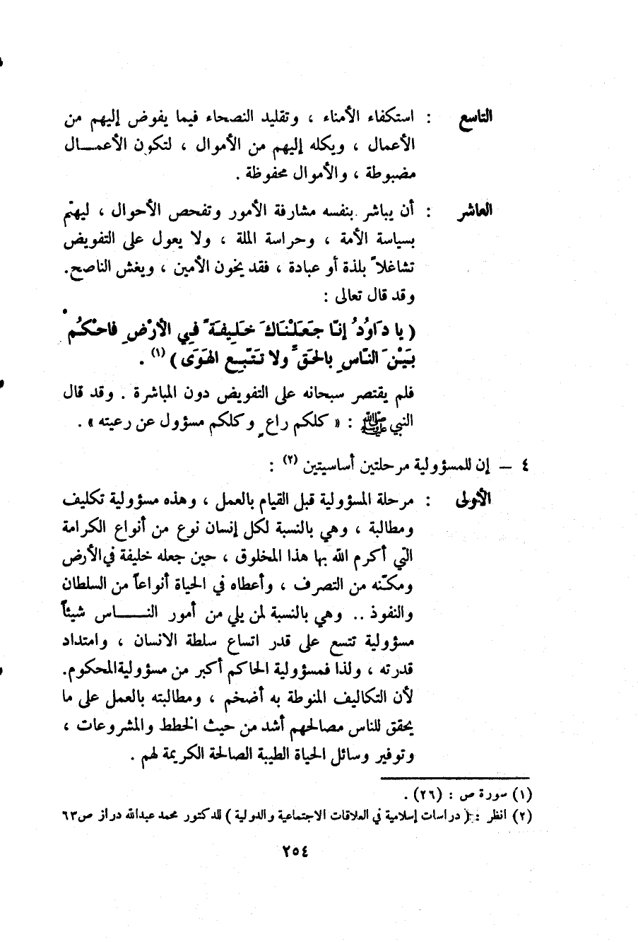 الأولى: مرحلة المسئولية قبل القيام بالعمل، وهذه مسئولية تكليف ومطالبة، وهي بالنسبة لكل إنسان نوع من أنواع الكرامة التي أكرم الله بها هذا المخلوق، حين جعله خليفة في الأرض ومكَّنه من التصرف، وأعطاه في الحياة أنواعًا من السلطان والنفوذ، وهي بالنسبة لمن يلي من أمور الناس شيئًا مسئولية تتسع على قدر اتساع سلطة الإنسان، وامتداد قدرته، ولذا فمسئولية الحاكم أكبر من مسئولية المحكوم؛ لأن التكاليف المنوطة به أضخم، ومطالبته بالعمل على ما يحقق للناس مصالحهم أشد من حيث الخطط والمشروعات، وتوفير وسائل الحياة الطيبة الصالحة الكريمة لهم.