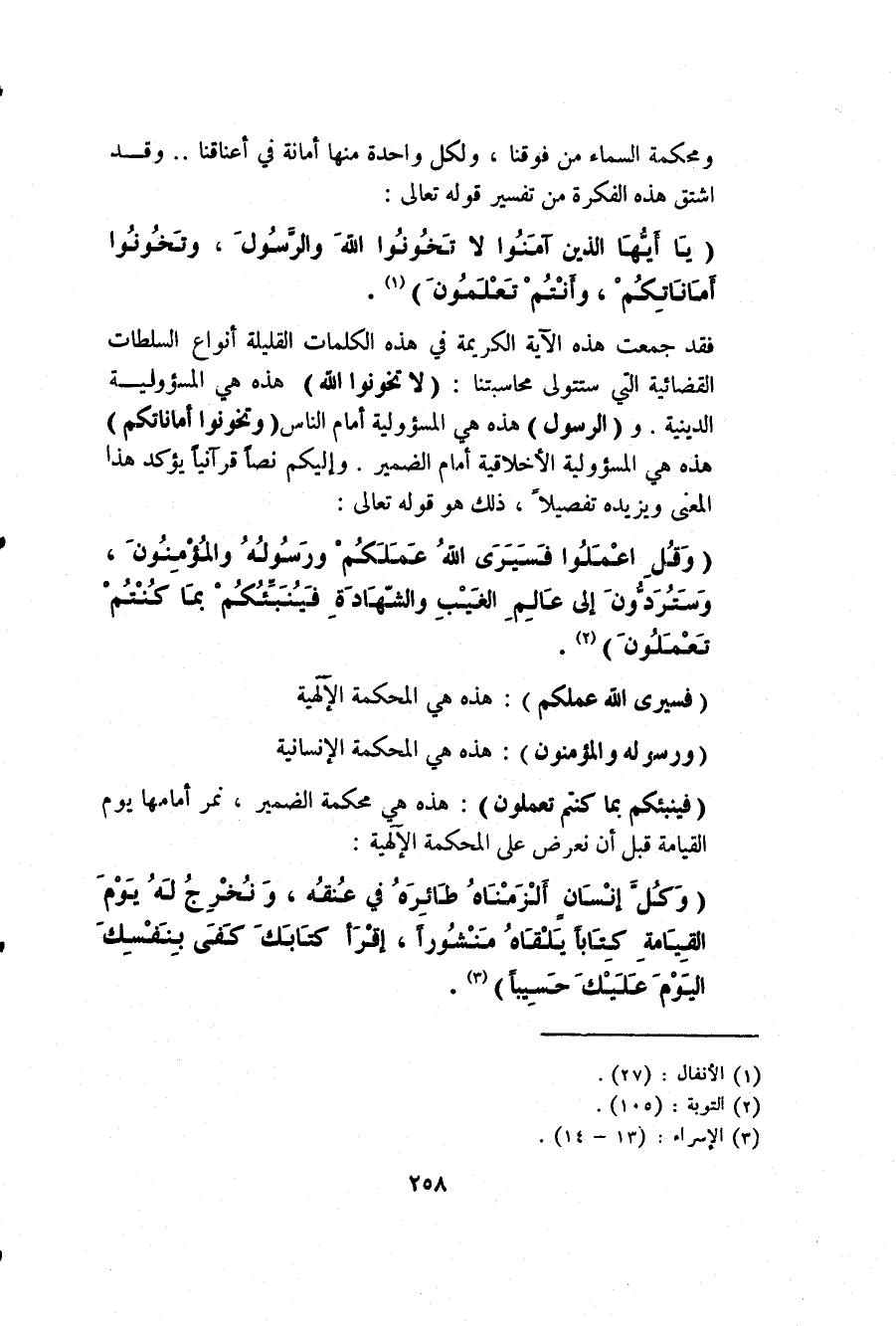 فقد جمعت هذه الآية الكريمة في هذه الكلمات القليلة أنواع السلطات القضائية التي ستتولى محاسبتنا: {لا تَخُونُوا اللَّهَ} هذه هي المسئولية الدينية. و {الرَّسُولَ} هذه هي المسئولية أمام الناس {وَتَخُونُوا أَمَانَاتِكُمْ} هذه هي المسئولية الأخلاقية أمام الضمير. وإليكم نصًّا قرآنيًا يؤكد هذا المعنى ويزيده تفصيلاً، ذلك هو قوله تعالى: {وَقُلِ اعْمَلُوا فَسَيَرَى اللَّهُ عَمَلَكُمْ وَرَسُولُهُ وَالْمُؤْمِنُونَ وَسَتُرَدُّونَ إِلَى عَالِمِ الْغَيْبِ وَالشَّهَادَةِ فَيُنَبِّئُكُمْ بِمَا كُنْتُمْ تَعْمَلُونَ} 2.