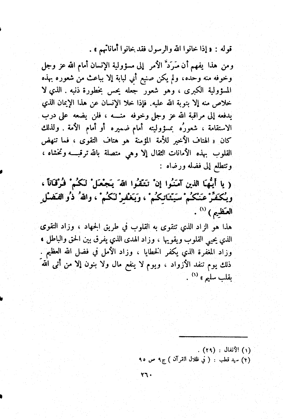 ومن هذا يفهم أن مَرَدَّ الأمر إلى مسئولية الإنسان أمام الله -عز جل- وخوفه منه وحده، ولم يكن صنيع أبي لبابة إلا بباعث من شعوره بهذه المسئولية الكبرى، وهو شعور جعله يحس بخطورة ذنبه. الذي لا خلاص منه إلا بتوبة الله عليه. فإذا خلا الإنسان عن هذا الإيمان الذي يدفعه إلى مراقبة الله -عز وجل- وخوفه منه، فلن يضعه على درب الاستقامة، شعوره بمسئوليته أمام ضميره أو أمام الأمة. ولذلك كان "الهتاف الأخير للأمة المؤمنة هو هتاف التقوى، فما تنهض القلوب بهذه الأمانات الثقال إلا وهي متصلة بالله ترقبه وتخشاه، وتتطلع إلى فضله ورضاه: