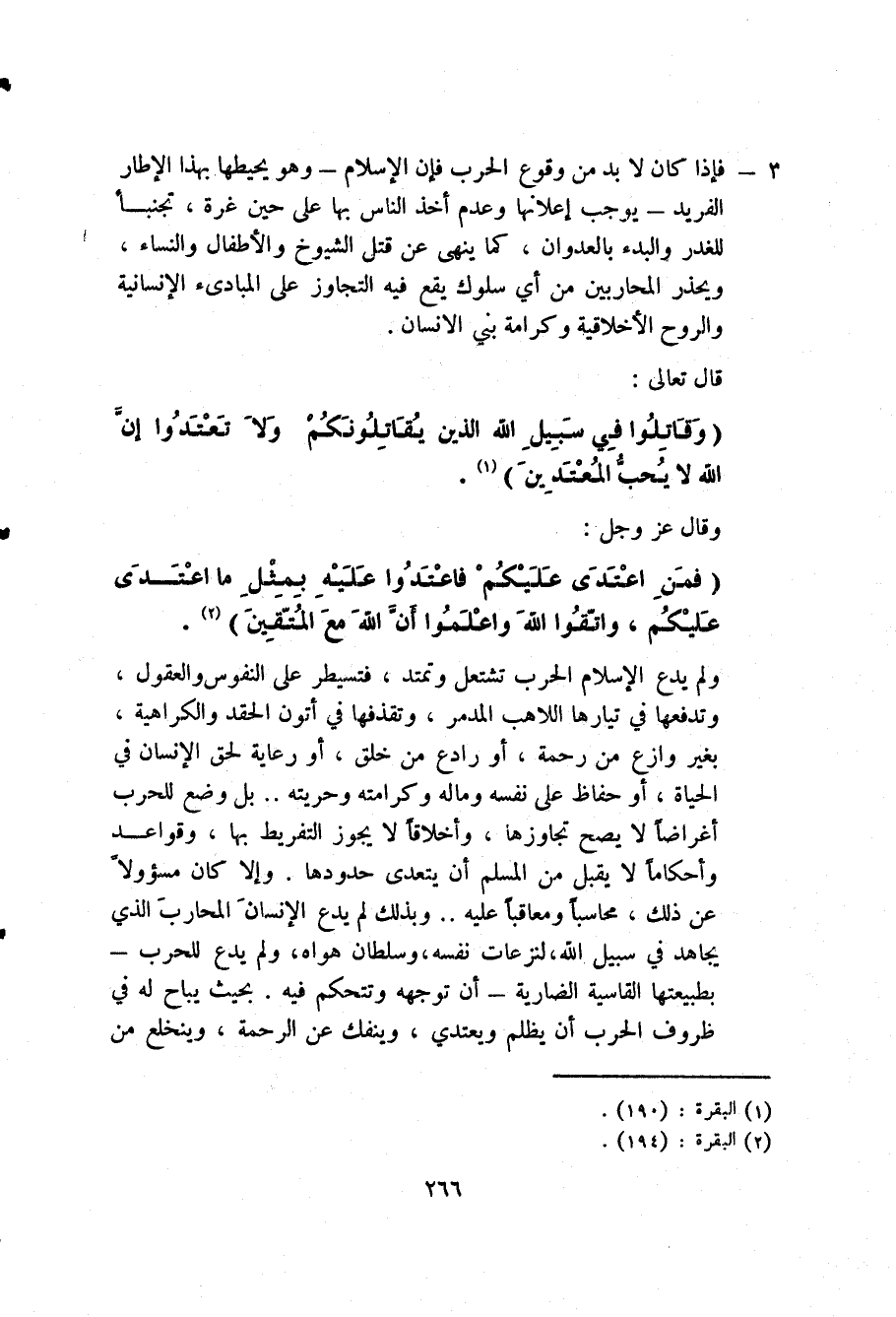 ولم يدع الإسلام الحرب تشتعل وتمتد؛ فتسيطر على النفوس والعقول، وتدفعها في تيارها اللاهب المدمر، وتقذفها في أتون الحقد والكراهية بغير وازع من رحمة، أو رادع من خلق، أو رعاية لحق الإنسان في الحياة، أو حفاظ على نفسه وماله وكرامته وحريته.. بل وضع للحرب أغراضًا لا يصح تجاوزها، وأخلاقًا لا يجوز التفريط بها، وقواعد وأحكامًا لا يقبل من المسلم أن يتعدى حدودها وإلا كان مسئولًا عن ذلك محاسبًا ومعاقبًا عليه.. وبذلك لم يدع الإنسان المحارب الذي يجاهد في سبيل الله لنزعات نفسه، وسلطان هواه، ولم يدع للحرب -بطبيعتها القاسية الضارية- أن توجهه وتتحكم فيه؛ بحيث يباح له في ظروف الحرب أن يظلم ويعتدى، وينفك عن الرحمة، وينخلع من