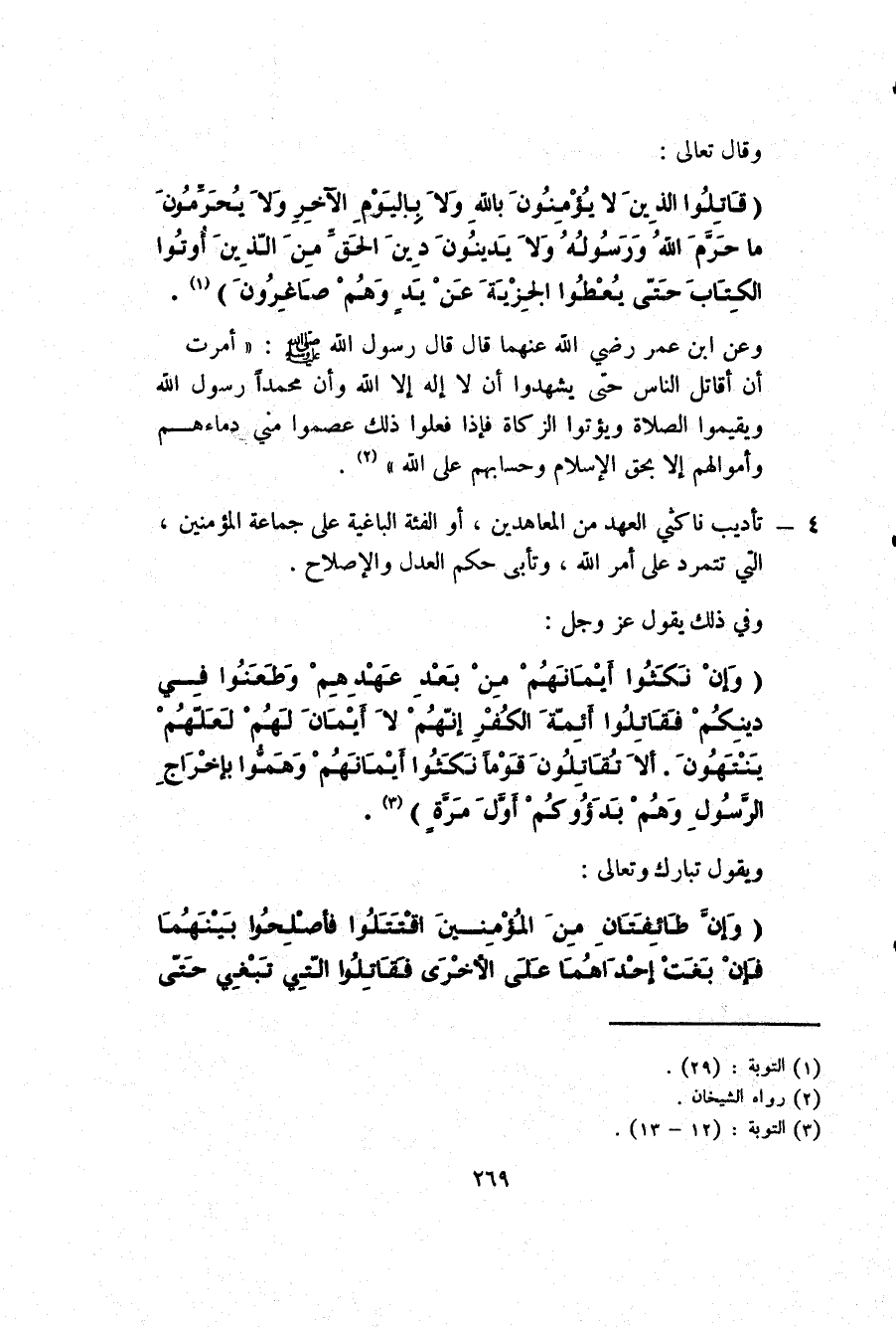 وقال تعالى: {قَاتِلُوا الَّذِينَ لا يُؤْمِنُونَ بِاللَّهِ وَلا بِالْيَوْمِ الآخِرِ وَلا يُحَرِّمُونَ مَا حَرَّمَ اللَّهُ وَرَسُولُهُ وَلا يَدِينُونَ دِينَ الْحَقِّ مِنَ الَّذِينَ أُوتُوا الْكِتَابَ حَتَّى يُعْطُوا الْجِزْيَةَ عَنْ يَدٍ وَهُمْ صَاغِرُونَ} 1.