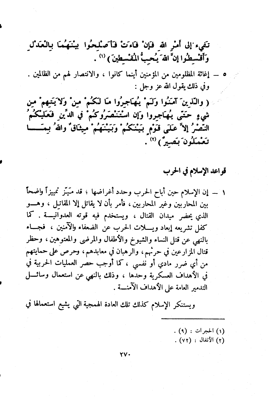 1- إن الإسلام حين أباح الحرب وحدد أغراضها؛ قد ميز تمييزًا واضحًا بين المحاربين وغير المحاربين، فأمر بألا يقاتل إلا المقاتل، وهو الذي يحضر ميدان القتال، ويستخدم فيه قوته العداونية، كما كفل تشريعه إبعاد ويلات الحرب عن الضعفاء والآمنين، فجاء بالنهي عن قتل النساء والشيوخ والأطفال والمرضى والمعتوهين، وحظر قتال المزارعين في حرثهم، والرهبان في معابدهم، وحرص على حمايتهم من أي ضرر مادي أو نفسي، كما أوجب حصر العمليات الحربية في الأهداف العسكرية وحدها، وذلك بالنهي عن استعمال وسائل التدمير العامة على الأهداف الآمنة.