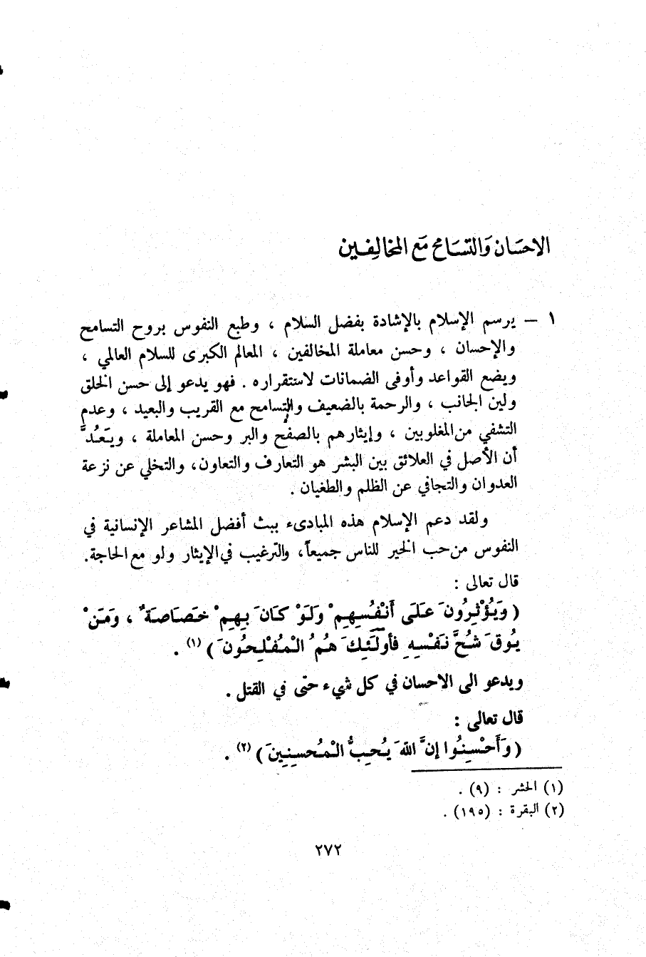 1- يرسم الإسلام بالإشادة بفضل السلام، وطبع النفوس بروح التسامح والإحسان، وحسن معاملة المخالفين، المعالم الكبرى للسلام العالمي، ويضع القواعد وأوفى الضمانات لاستقراره، فهو يدعو إلى حسن الخلق ولين الجانب، والرحمة بالضعيف والتسامح مع القريب والبعيد، وعدم التشفي من المغلوبين، وإيثارهم بالصفح والبر وحسن المعاملة، ويعدُّ أن الأصل في العلائق بين البشر هو التعارف والتعاون، والتخلي عن نزعة العدوان والتجافي عن الظلم والطغيان.