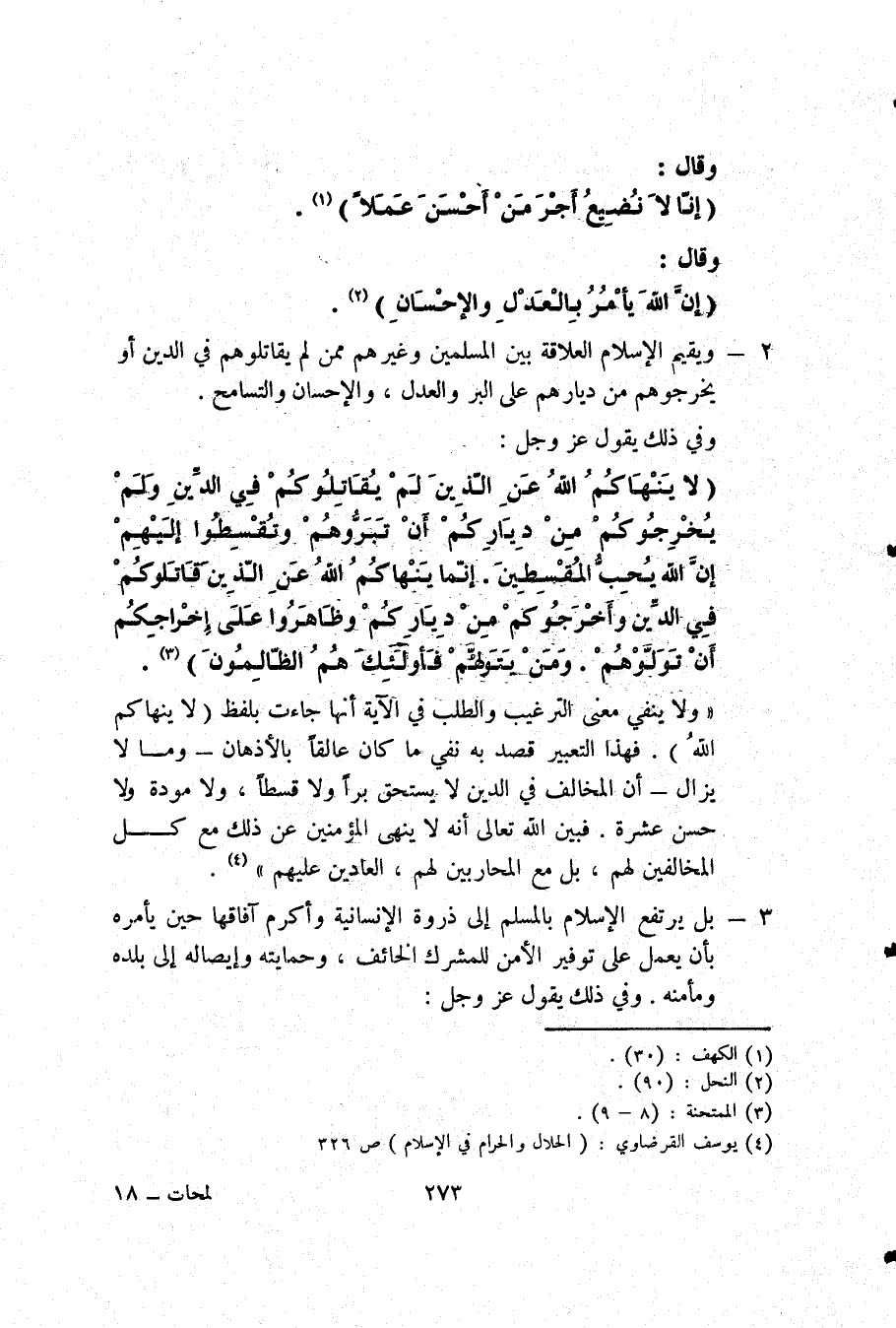 2- ويقيم الإسلام العلاقة بين المسلمين وغيرهم ممن لم يقاتلوا في الدين أو يخرجوا من ديارهم على البر والعدل، والإحسان والتسامح.