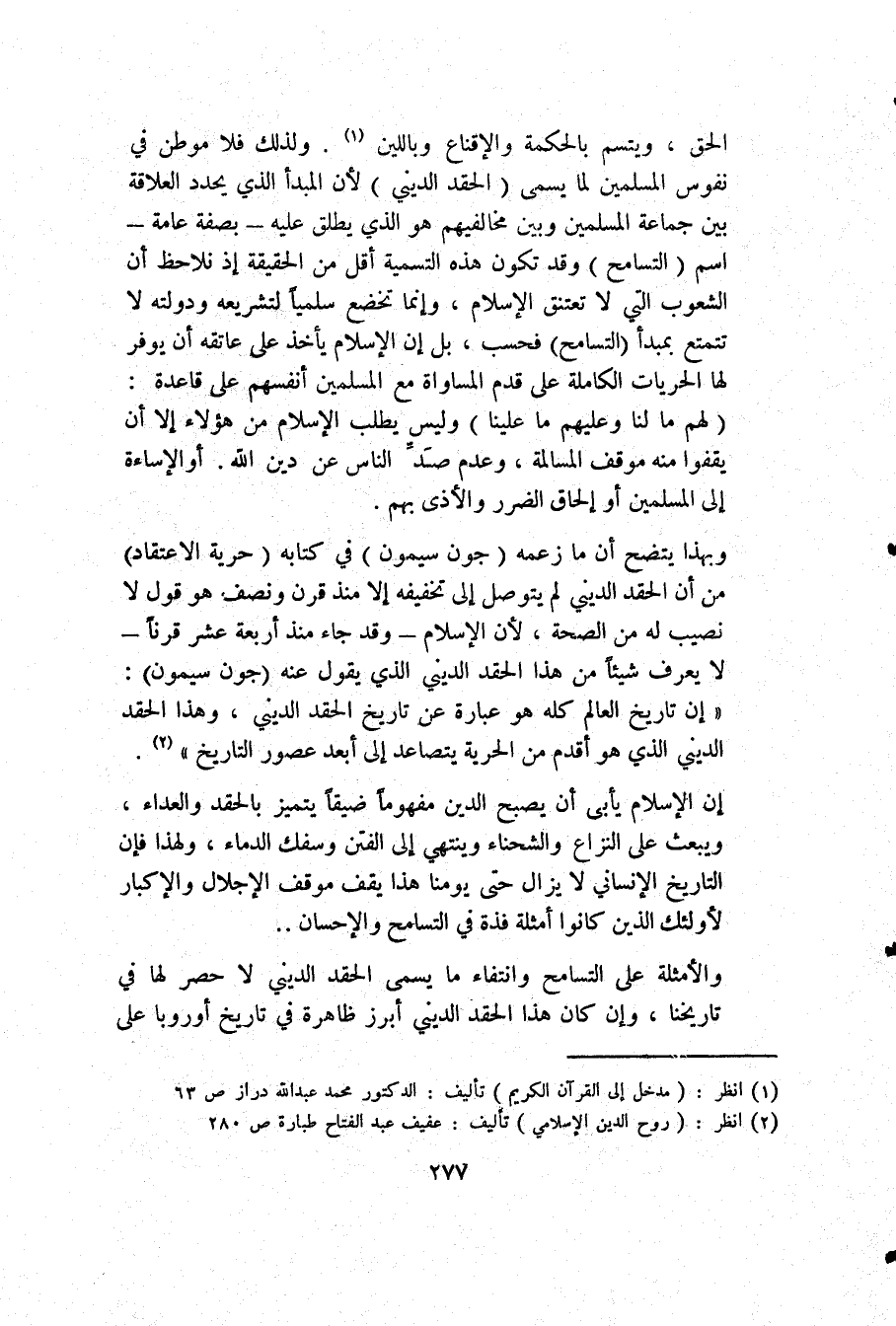 الحق، ويتسم بالحكمة والإقناع وباللين1، ولذلك فلا موطن في نفوس المسلمين لما يسمى "الحقد الديني"؛ لأن المبدأ الذي يحدد العلاقة بين جماعة المسلمين وبين مخالفيهم هو الذي يطلق عليه -بصفة عامة- اسم "التسامح" وقد تكون هذه التسمية أقل من الحقيقة؛ إذ نلاحظ أن الشعوب التي لا تعتنق الإسلام، وإنما تخضع سلميًّا لتشريعه ودولته لا تتمتع بمبدأ "التسامح" فحسب، بل إن الإسلام يأخذ على عاتقه أن يوفر لها الحريات الكاملة على قدم المساواة مع المسلمين أنفسهم على قاعدة: "لهم ما لنا وعليهم ما علينا" ولا يطلب الإسلام من هؤلاء إلا أن يقفوا منه موقف المسالمة، وعدم صَدِّ الناس عن دين الله، أو الإساءة إلى المسلمين أو إلحاق الضرر والأذى بهم.